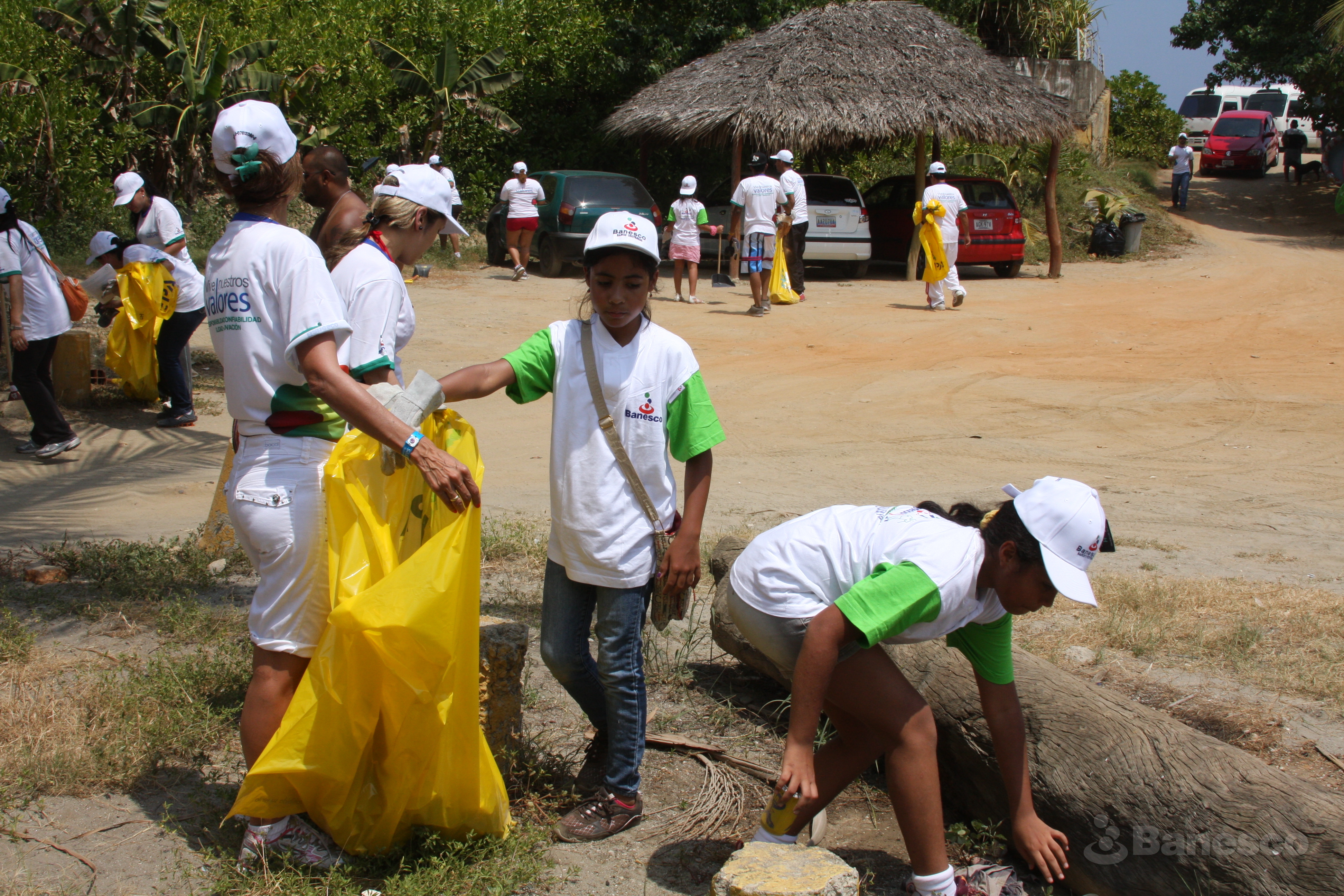 Voluntarias Banesco durante la recopilación de desechos sólidos en la playa.