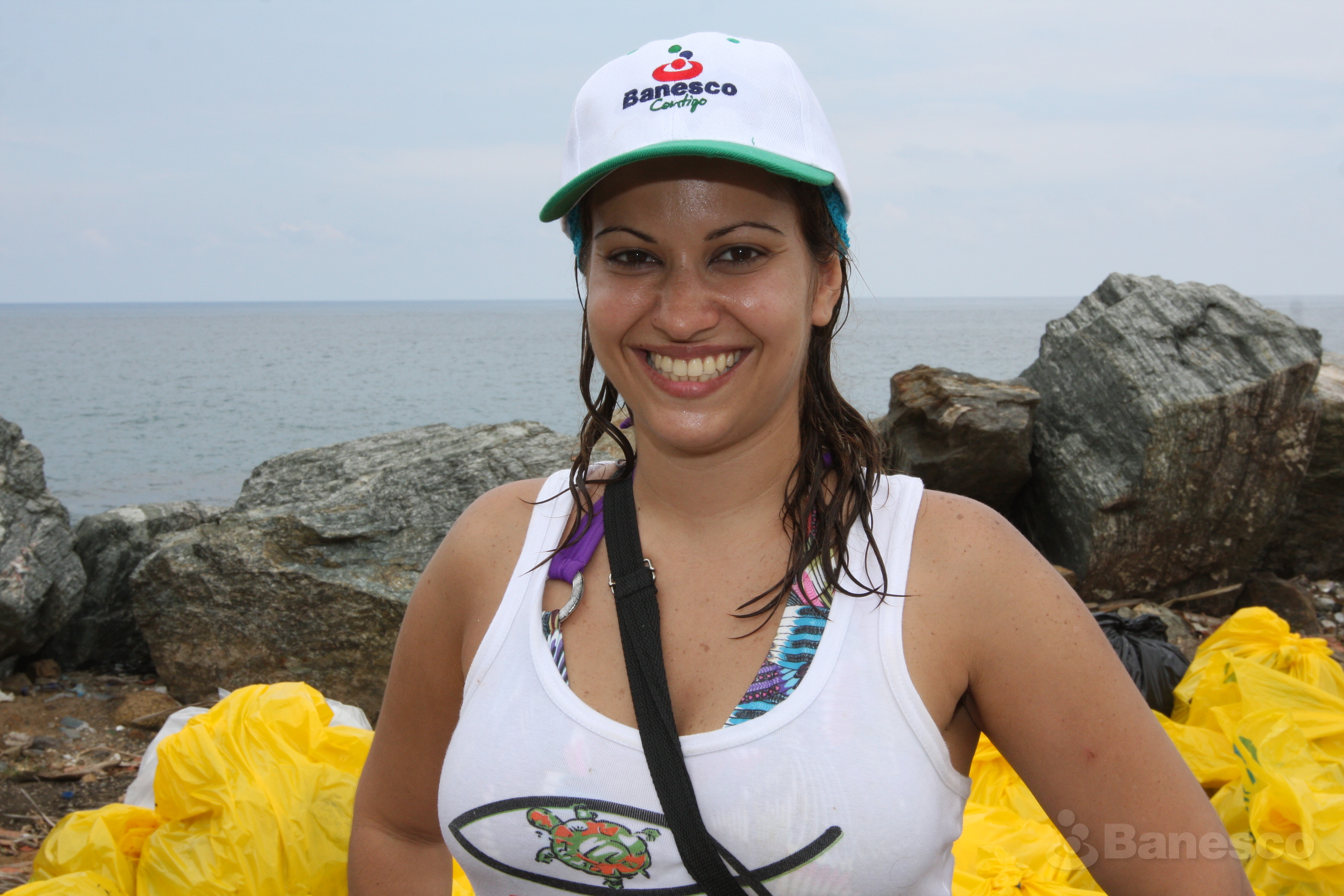 Ana María Rodríguez Ferreira participante del Voluntariado Banesco contribuyendo a la recolección de desechos sólidos en Playa Escondida en el marco del Día Mundial de las Playas.
