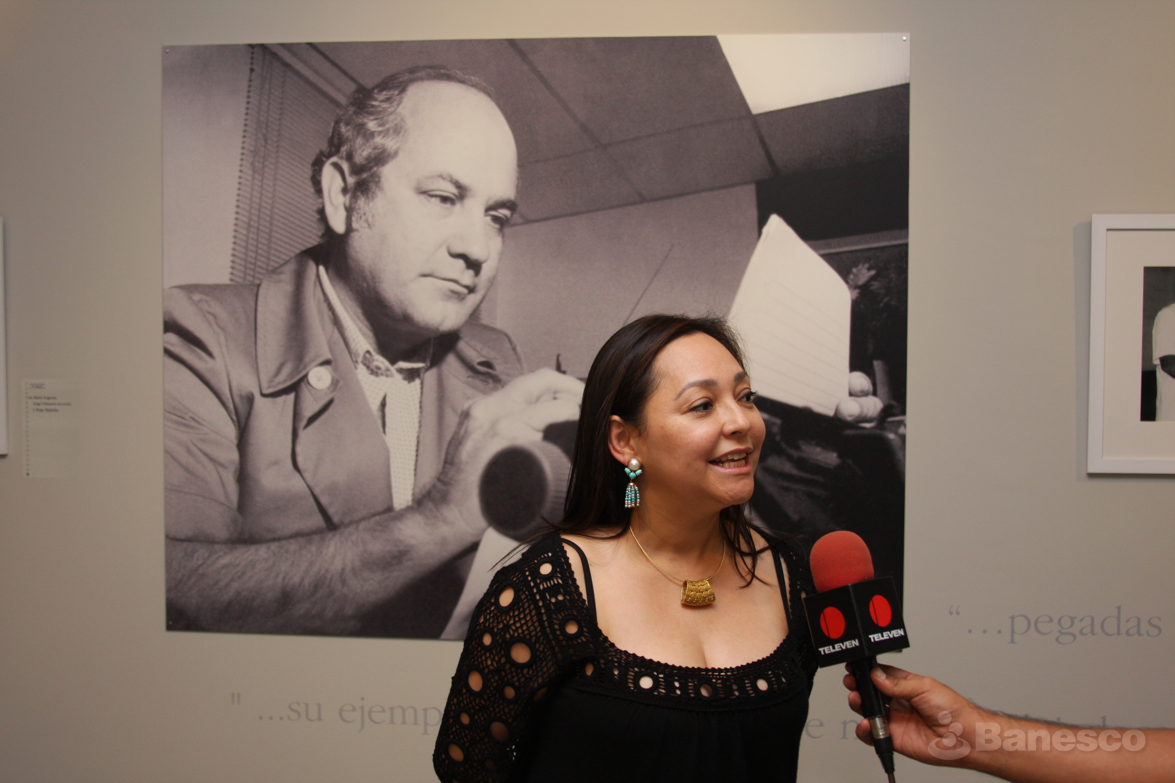 Mariela Colmenares, Vp. de Comunicaciones y RSE de Banesco, es entrevistada por la cadena de televisión Televen, durante el bautizo y exposición del libro "El día y la huella" del periodista Jesús Sanoja Hernández.