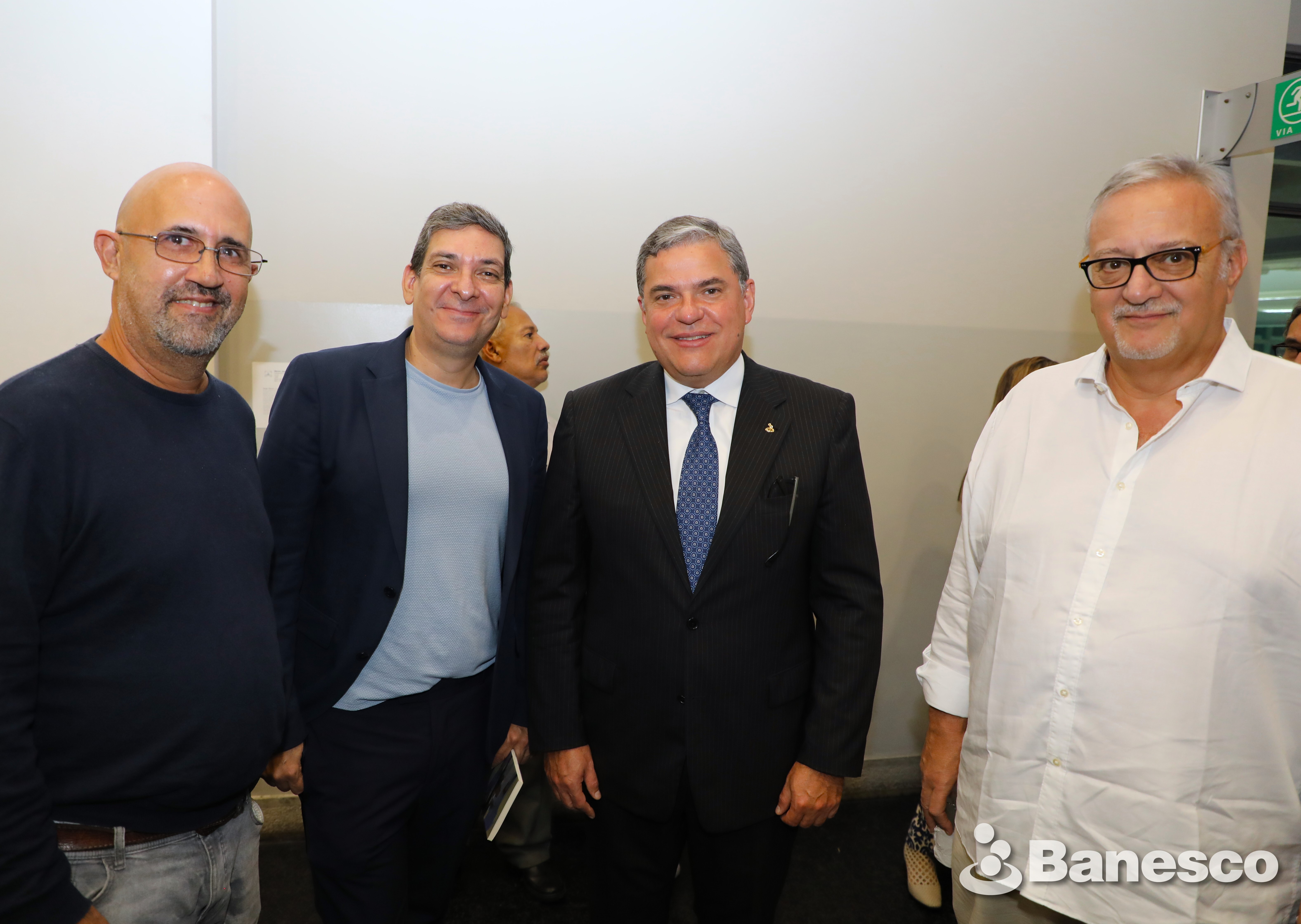 Pedro García, Simón Villamizar, Marco Ortega y Sergio Dahbar durante el evento de presentación del libro "Agua que corre lenta" elaborado en los espacios de Ciudad Banesco
