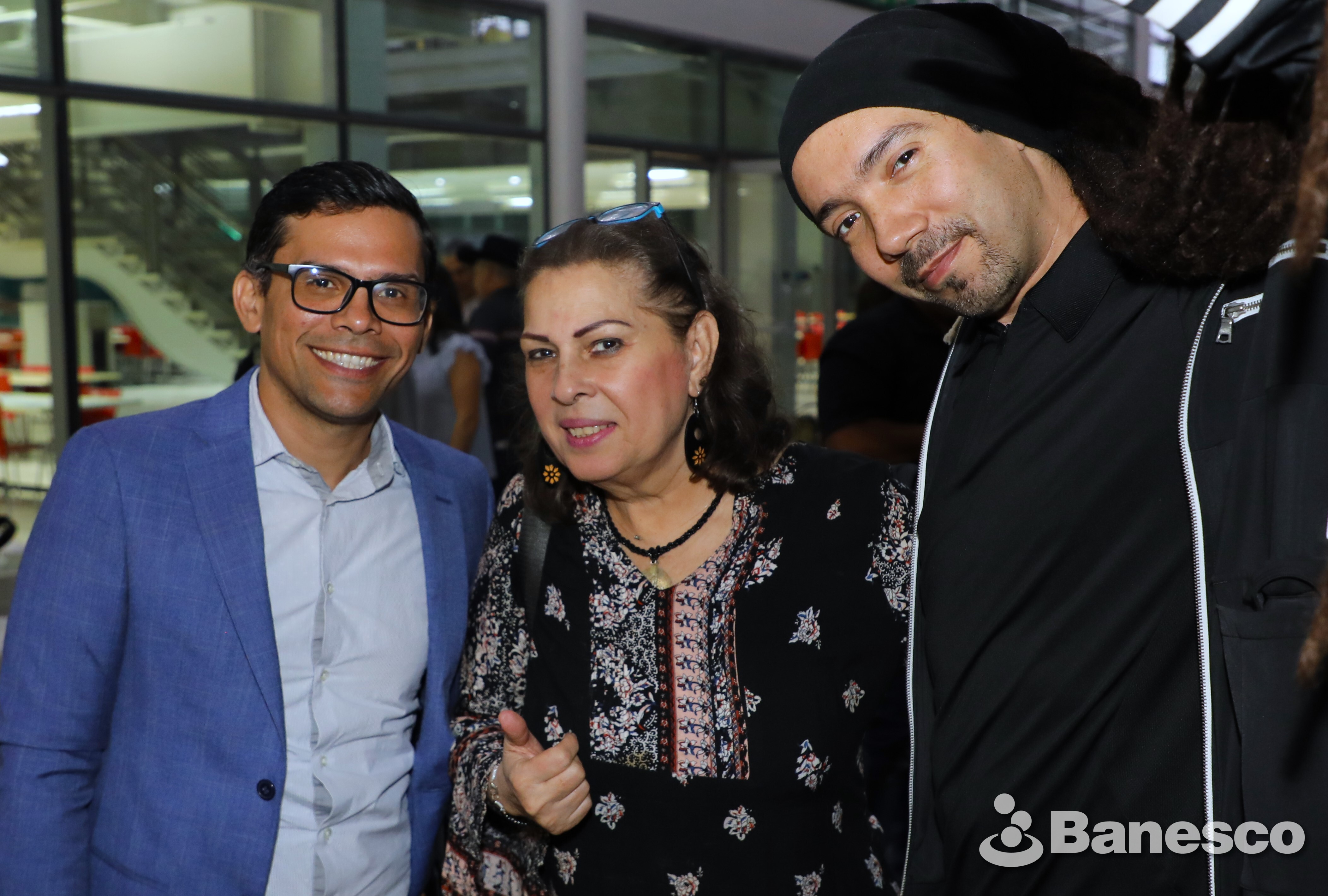 Wilfredo Rodríguez, Nubia González y Juan David Chacón en los espacios de Ciudad Banesco durante el evento de presentación del libro "Agua que corre lenta"