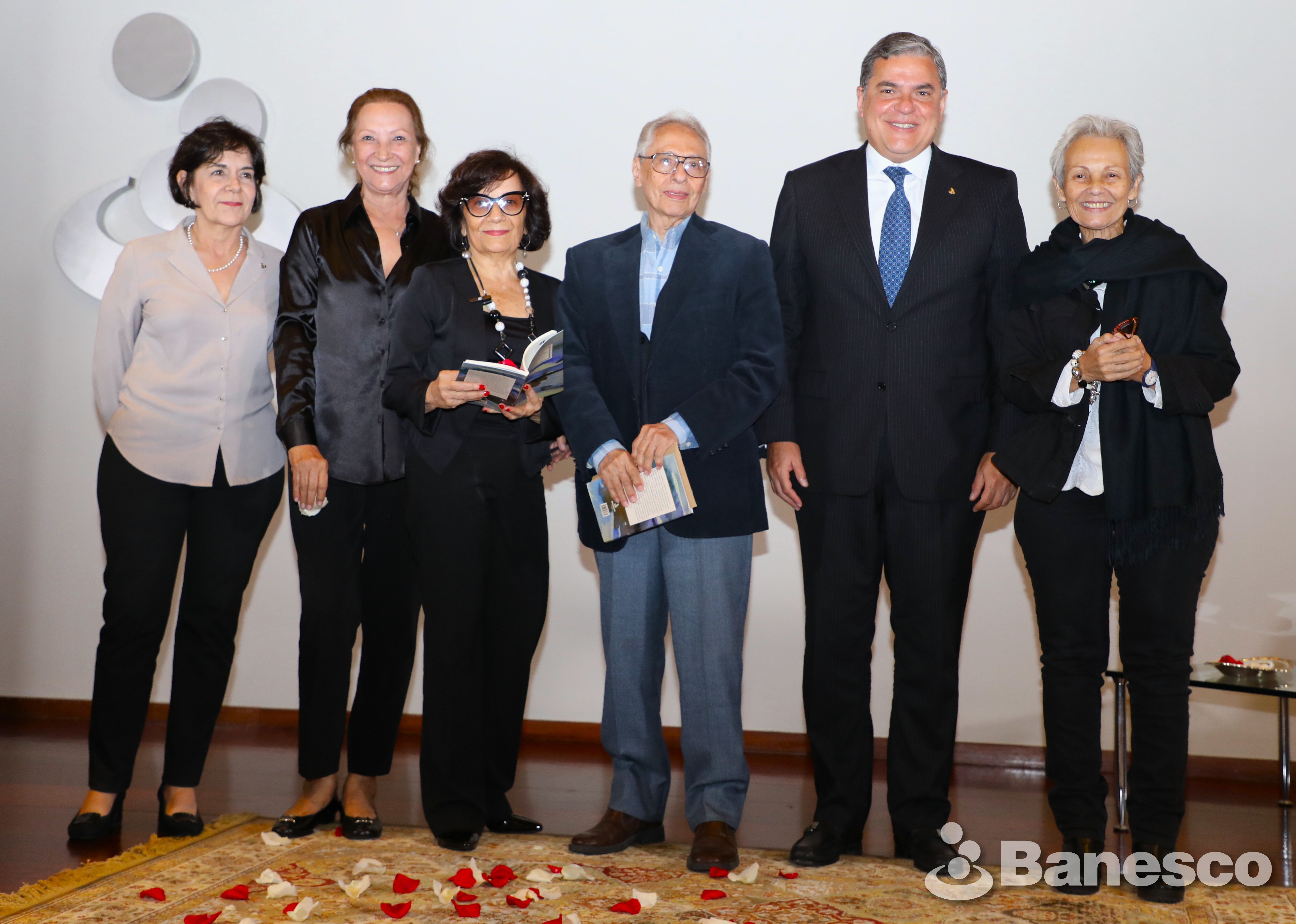 Rosamaria Atencio, Luna Benítez, Renaud Coromoto, José Balza, Marco Julio Ortega y Julieta León durante el evento de presentación del libro "Agua que corre lenta", evento que se llevo acabo en Ciudad Banesco
