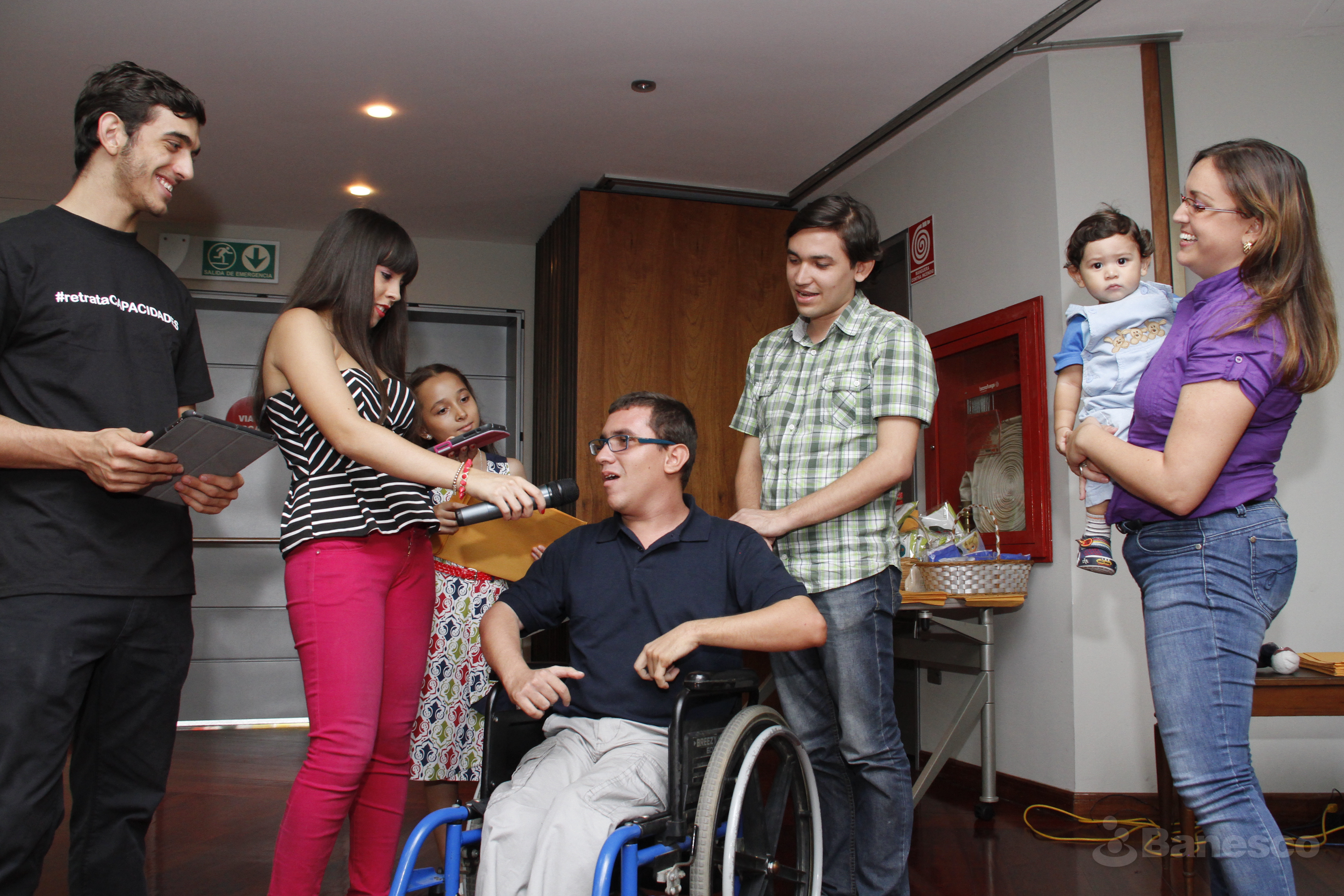 Mariana Guzmán y animador del evento junto a representantes y participantes de la 9° edición del Concurso fotográfico sobre personas con discapacidad ¡Aquí estamos 2014! realizado en Ciudad Banesco.