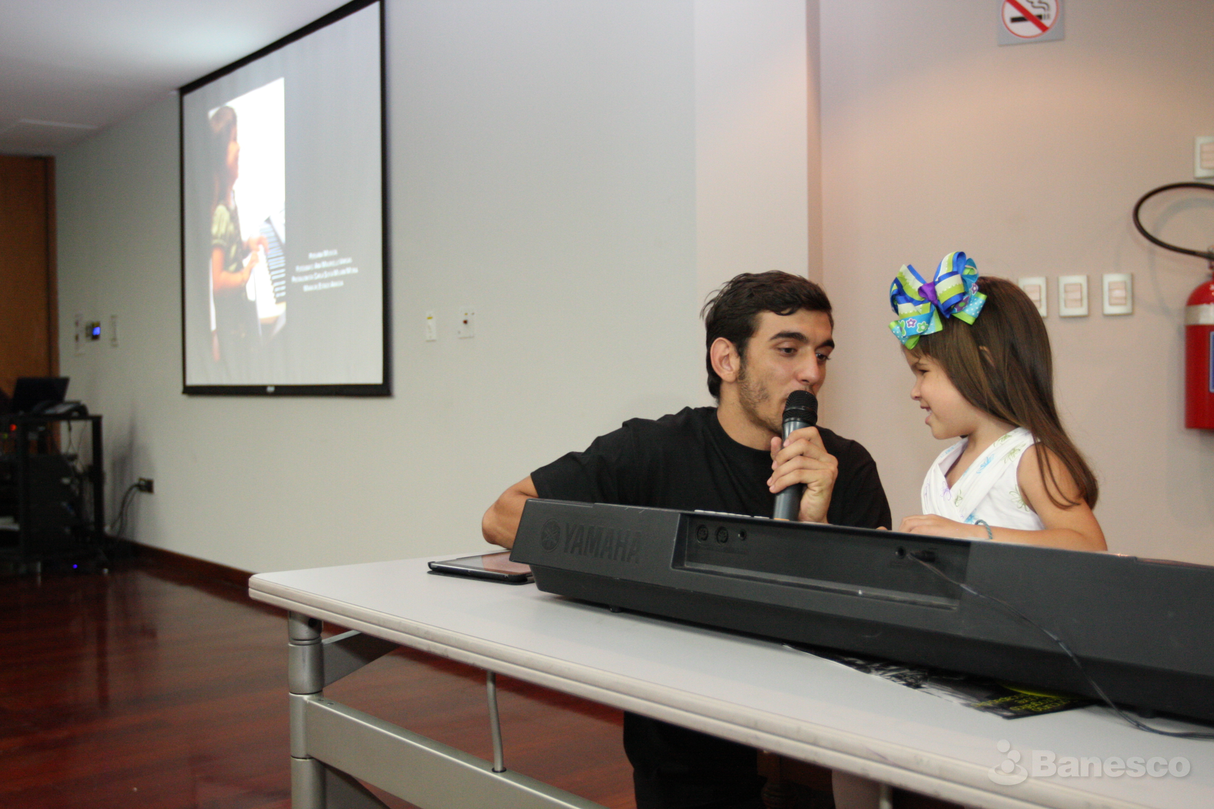 Christián Pérez animador de la Fundación Paso a Paso junto a Carla Sofía Miliani participante de la 9° edición del Concurso fotográfico sobre personas con discapacidad ¡Aquí estamos 2014! realizado en los espacios de Ciudad Banesco.
