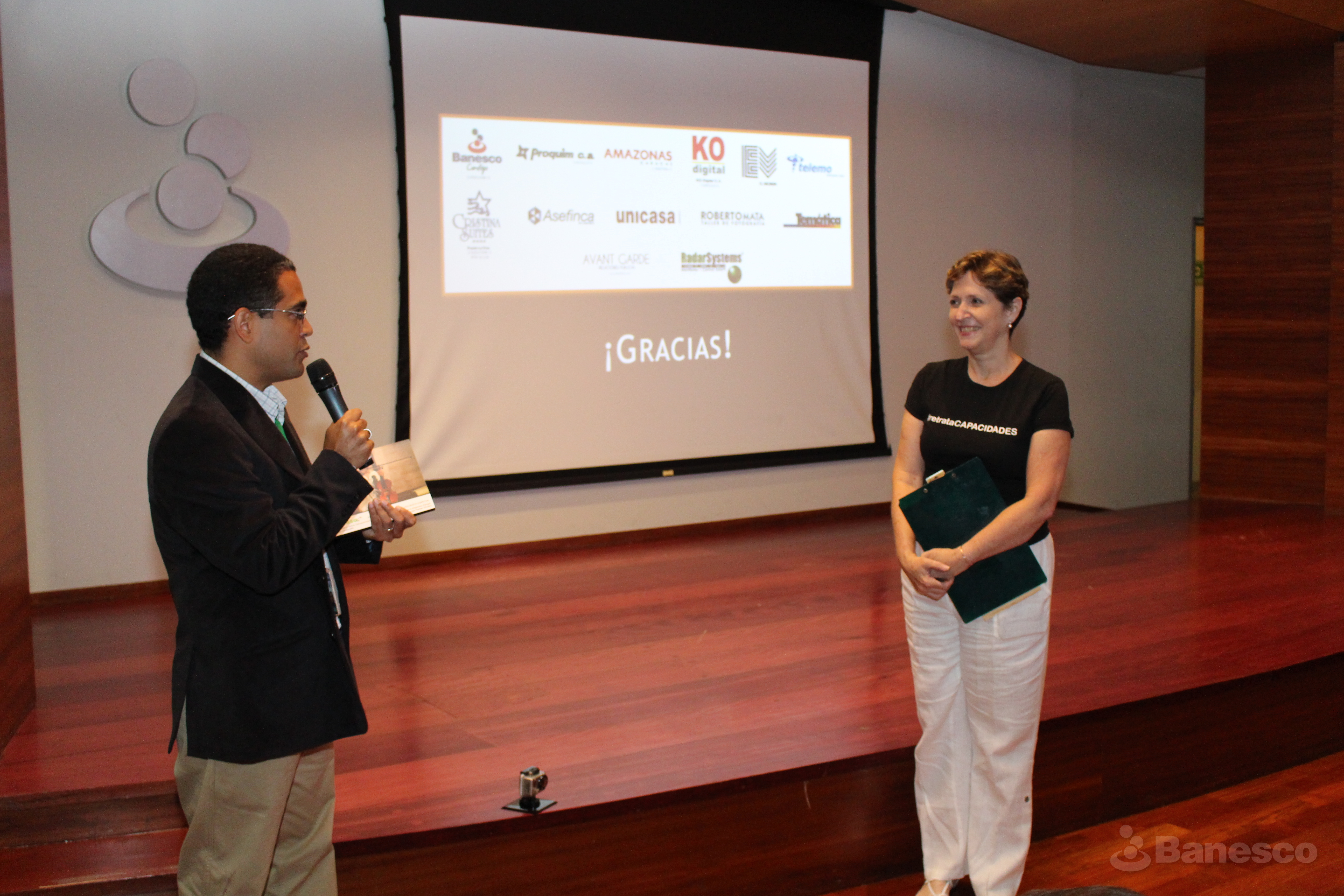 Norberto Méndez de la Vp. de Comunicaciones y RSE de Banesco junto a Angela Couret directora de la Fundación Paso a Paso, durante la presentación de la 11° edición de entrega de premios del Concurso Fotográfico sobre Personas con Discapacidad, realizado en los espacios de Ciudad Banesco.