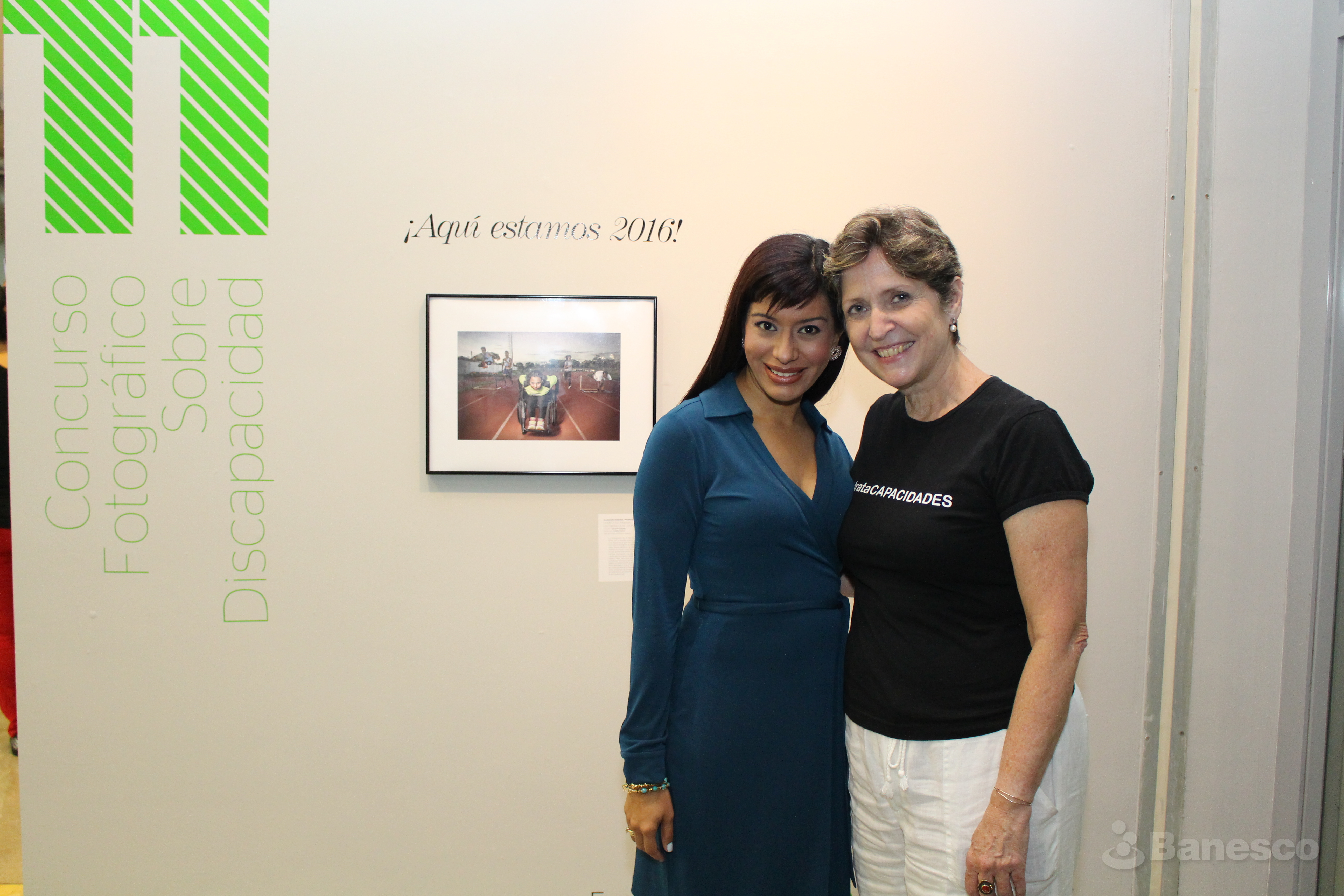 La presentadora Gaudy Perozo junto a Angela Couret directora de la Fundación Paso a Paso en las instalaciones de Ciudad Banesco durante la exposición fotográfica de la 11° edición del Concurso sobre Personas con Discapacidad ¡Aquí estamos 2016!.