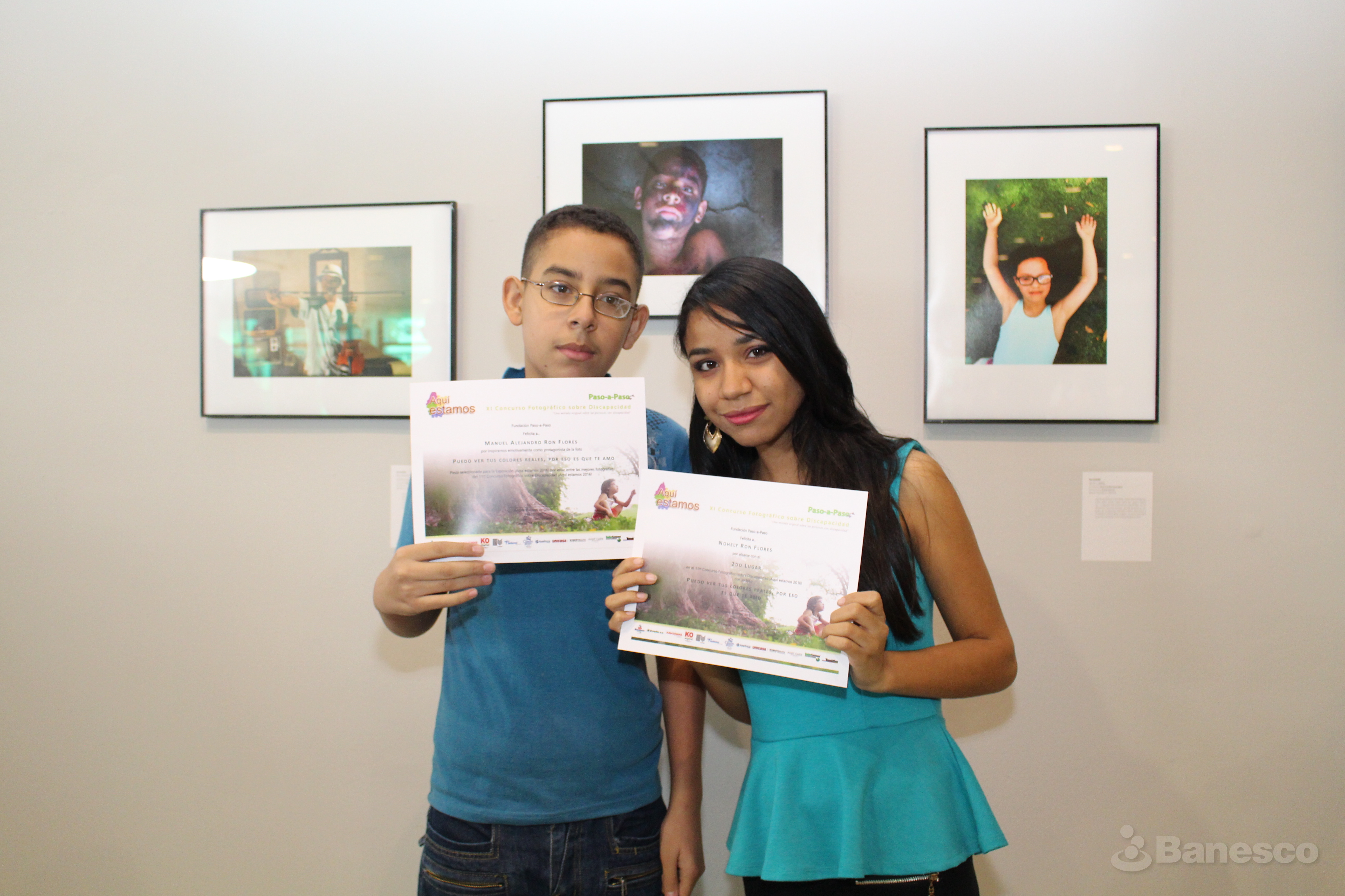 Manuel Ron y Nohely Ron de la Fundación Paso a Paso muestran sus reconocimientos con motivo de celebrarse la 11° edición de entrega de premios del Concurso Fotográfico sobre Personas con Discapacidad ¡Aquí estamos 2016!, realizado en Ciudad Banesco.