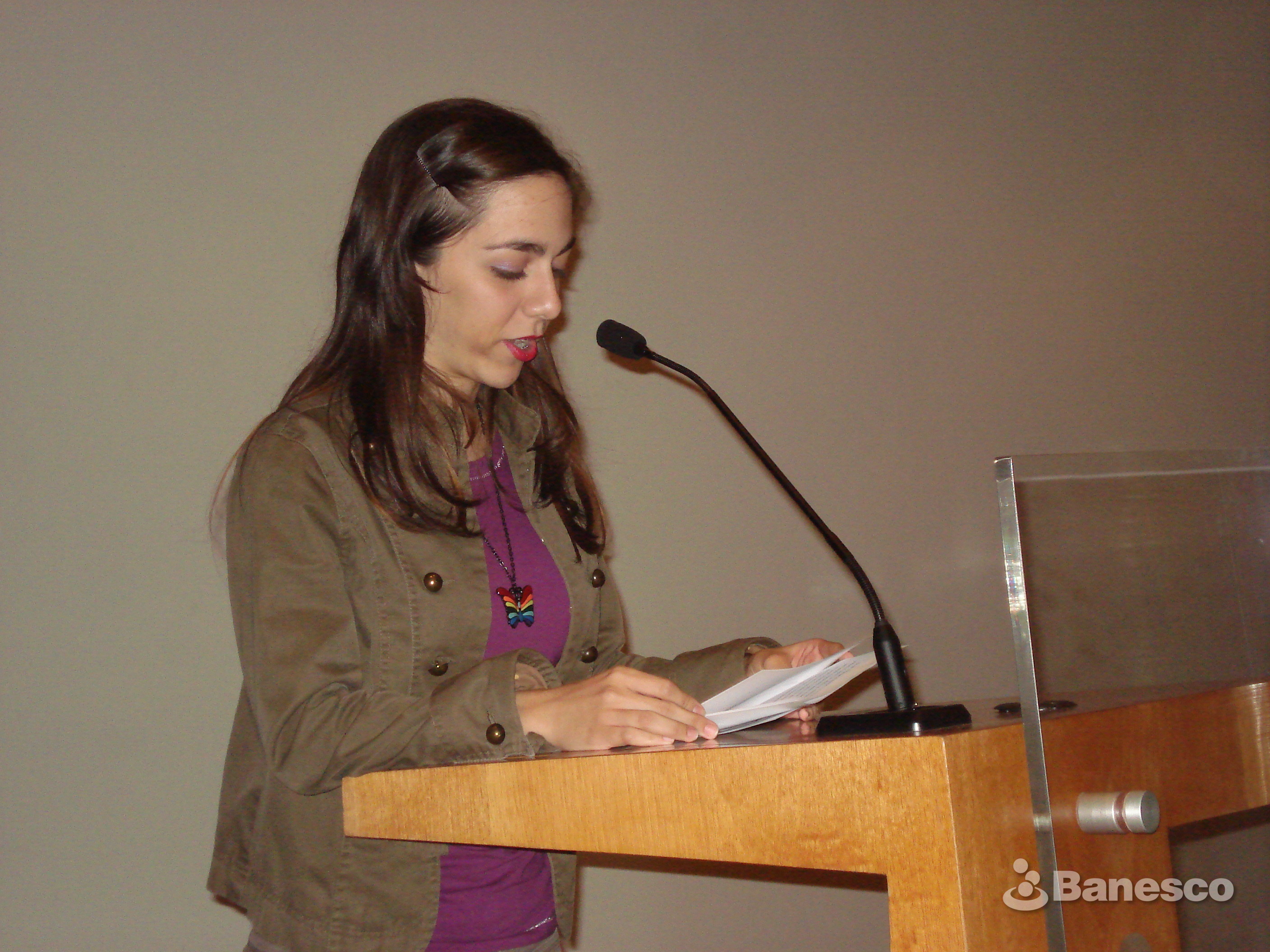 Microempresaria de la Banca Comunitaria ofreciendo sus palabras durante el evento de certificación por el 1er Programa de Fortalecimiento de Microempresarios de Banesco.