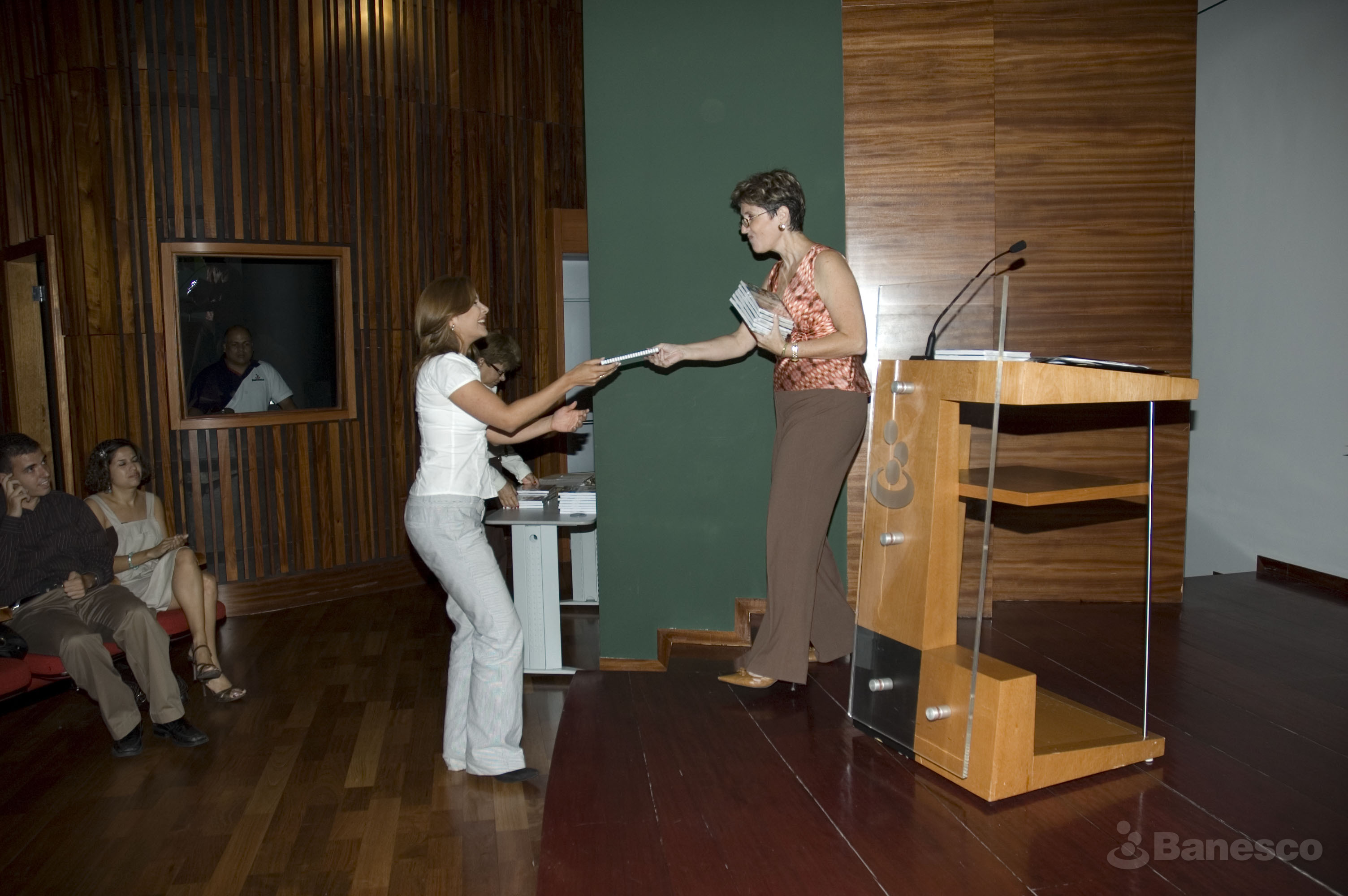 Angela Couret representante de la Fundación Paso a Paso hace entrega de libros en el auditorio Fernando crespo Suñer de Ciudad Banesco.