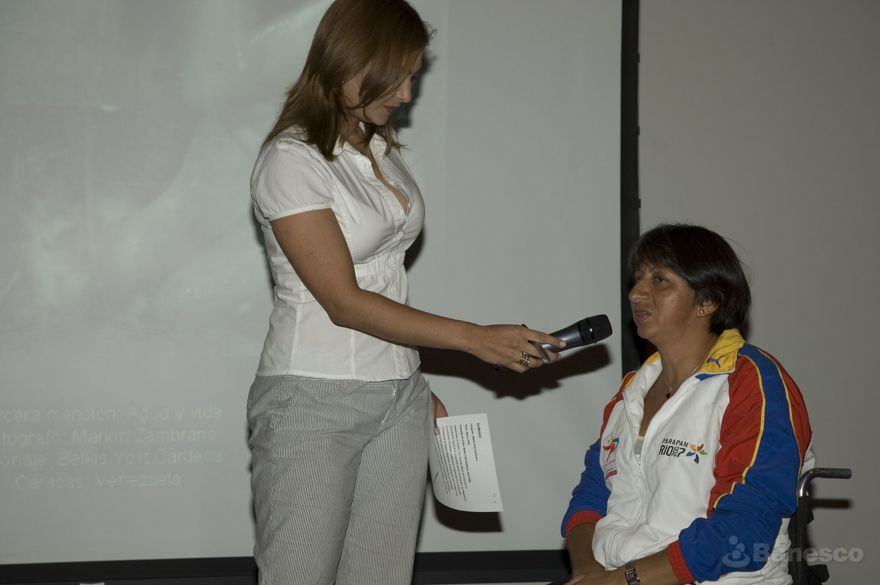La presentadora del evento durante la entrega de premios de la 3° edición del Concurso Fotográfico sobre Discapacidad ¡Aquí Estamos 2008! de la Fundación Paso a Paso.