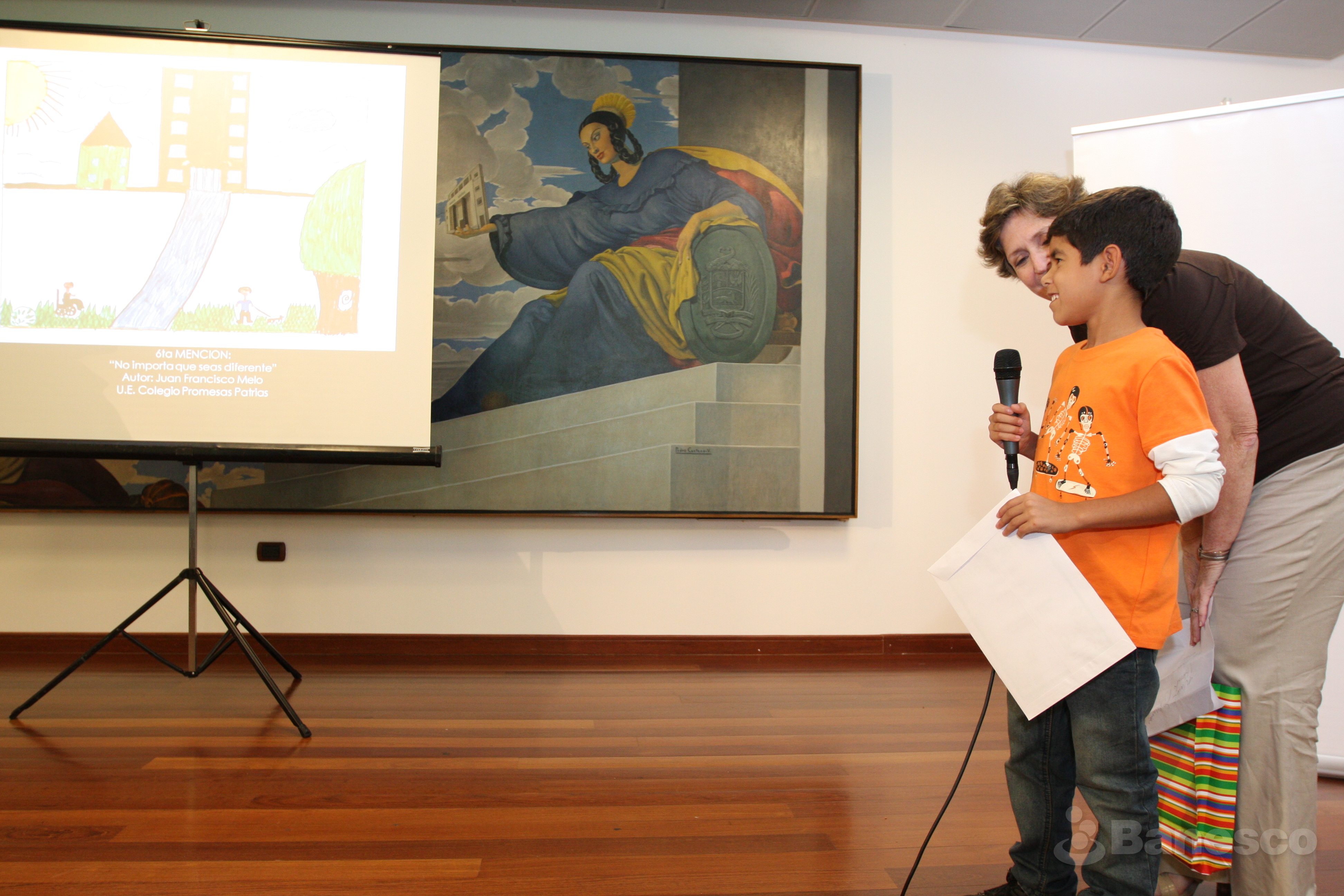 Juan Francisco Melo de la U.E Promesas Patrias, ganador de la 6ta mención del concurso que reconoce los dibujos de niños y adolescentes que demuestran cómo es posible la integración de niños especiales en colegios regulares. El Proyecto "Una escuela para todos" es uno de los proyectos desarrollado por la Fundación Paso a Paso en alianza con Banesco.