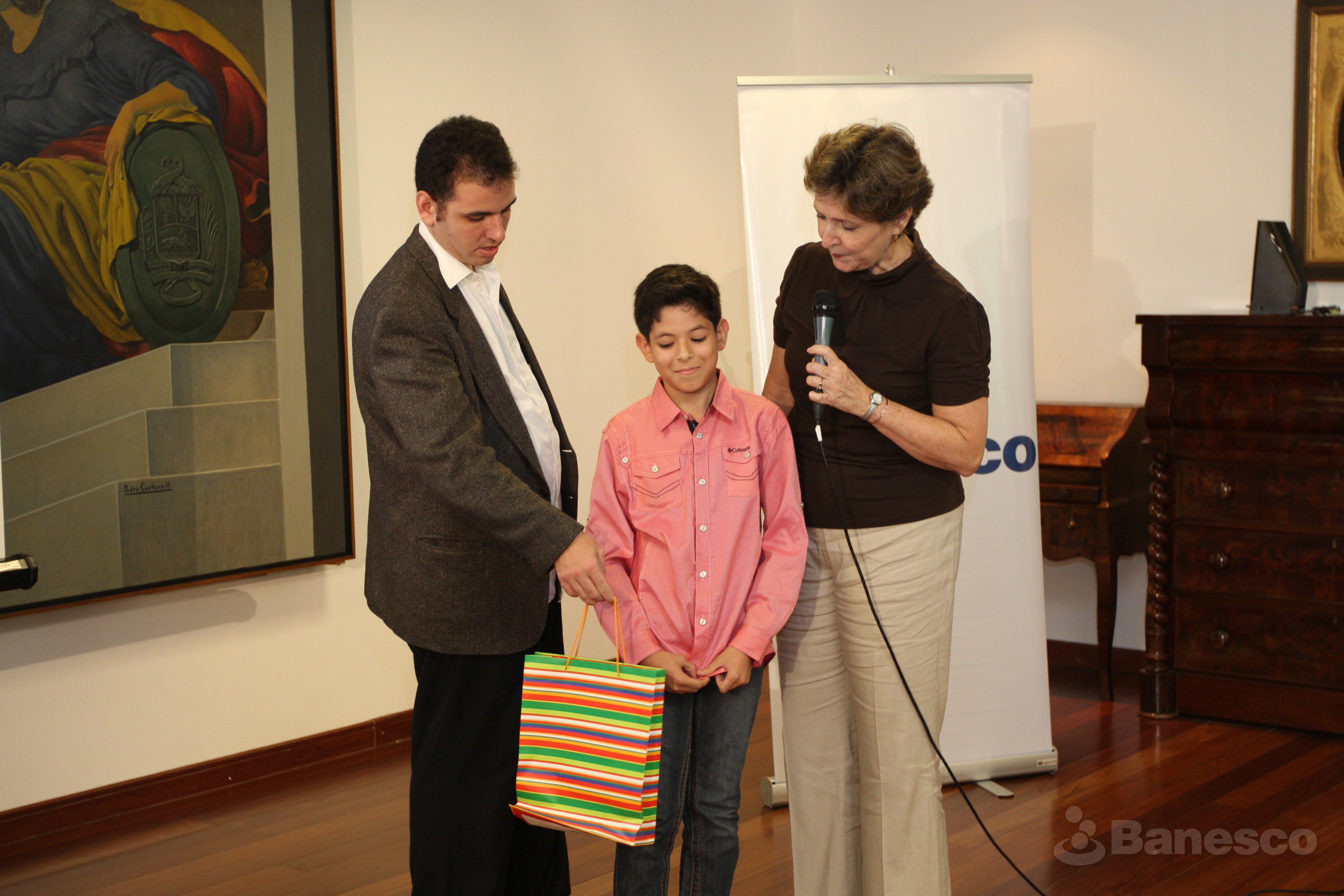 Participante del concurso de dibujo "Una escuela para todos" durante la entrega de obsequio por parte de Angela Couret directora de la Fundación Paso a Paso, en el evento realizado en los espacios de Ciudad Banesco.
