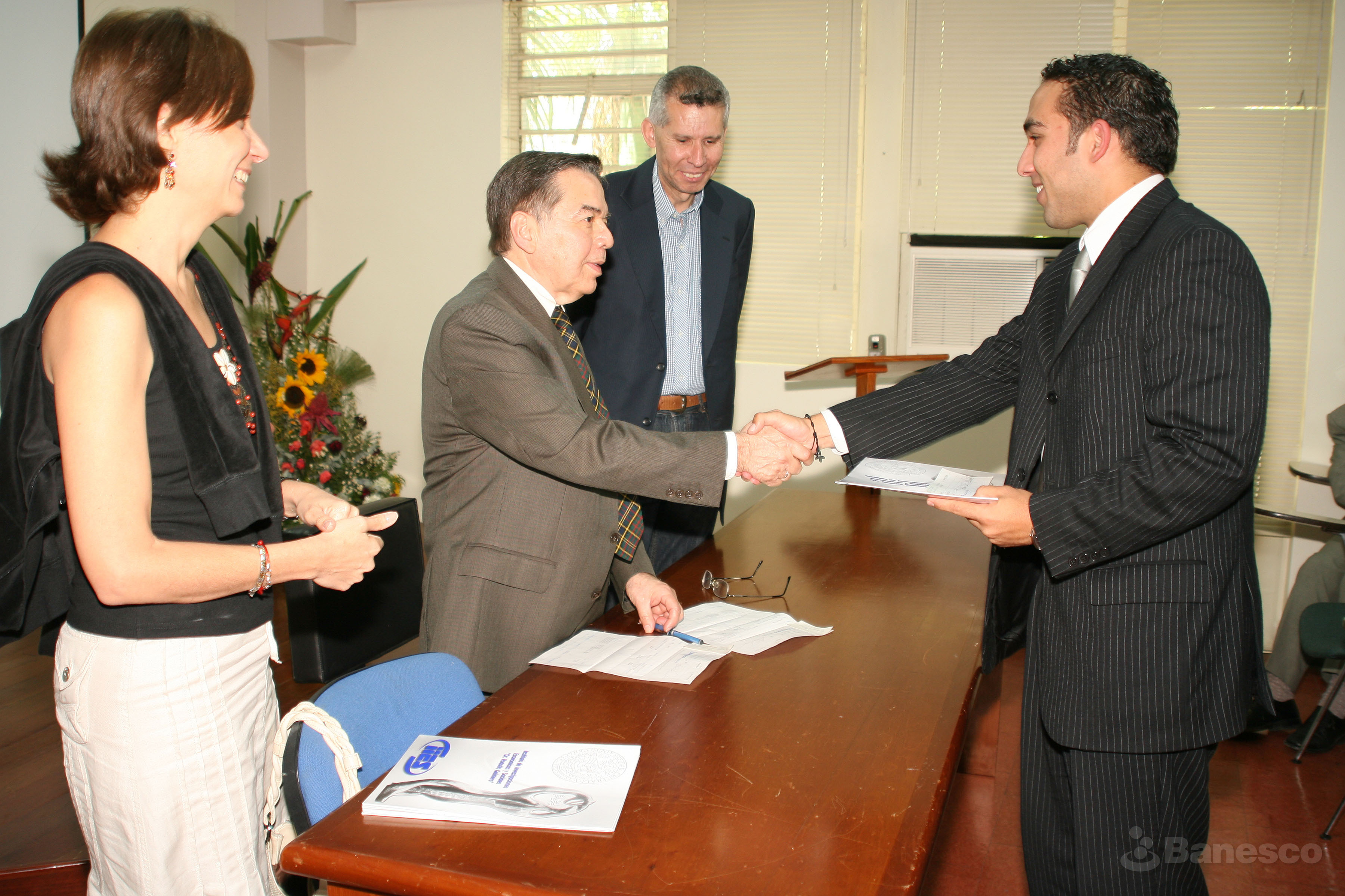 Ganador recibiendo premio en métalico de manos de Pedro Coa, vicepresidente de Estudios Económicos de Banesco Banco Universal por haber sido seleccionado en la V Edición de Ensayos en Economía de la UCV.