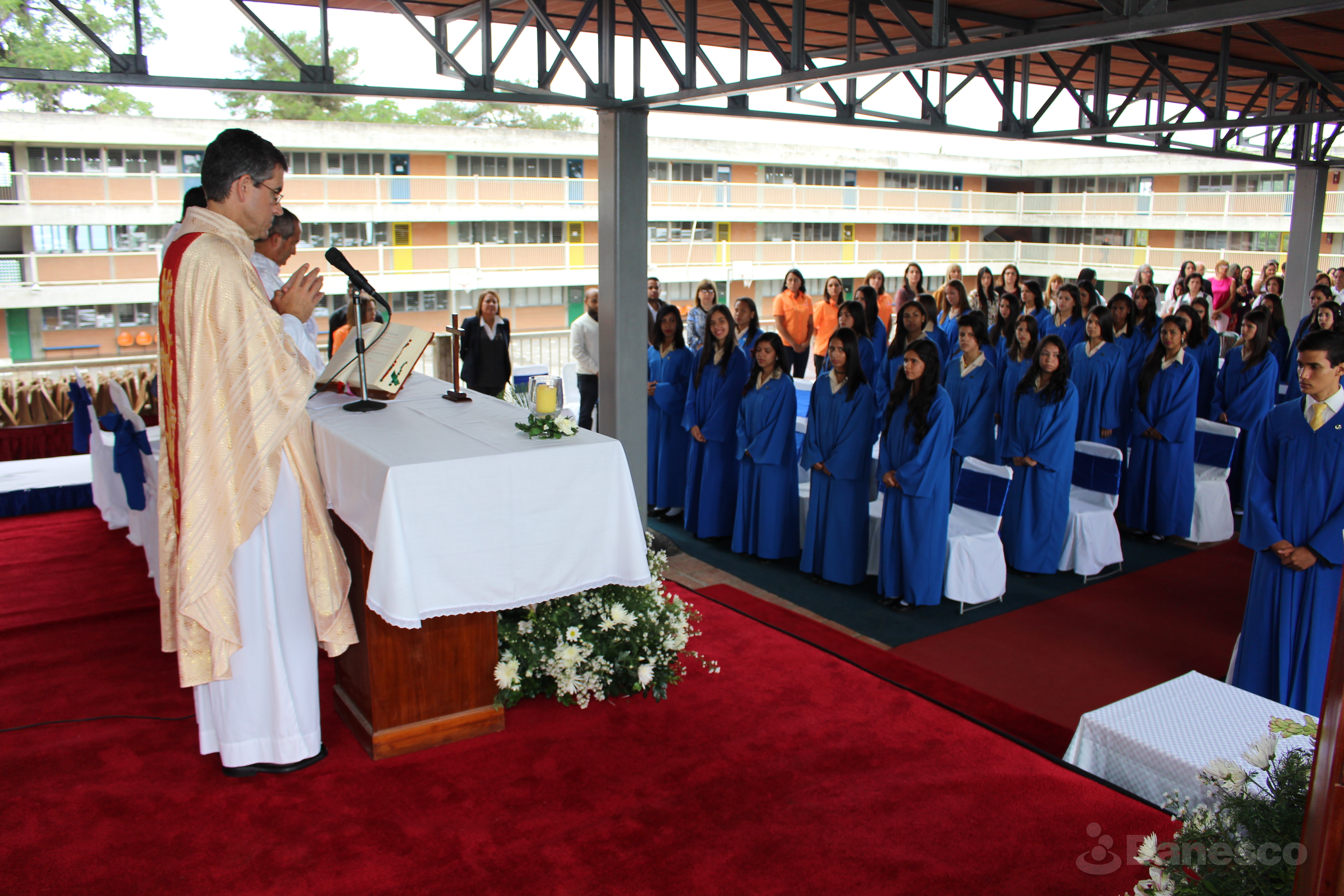 Bendición por parte del sacerdote durante el acto de graduación de 66 alumnos de bachillerato de la unidad educativa Mano Amiga, quienes realizaron sus estudios apadrinados por TodoTicket.