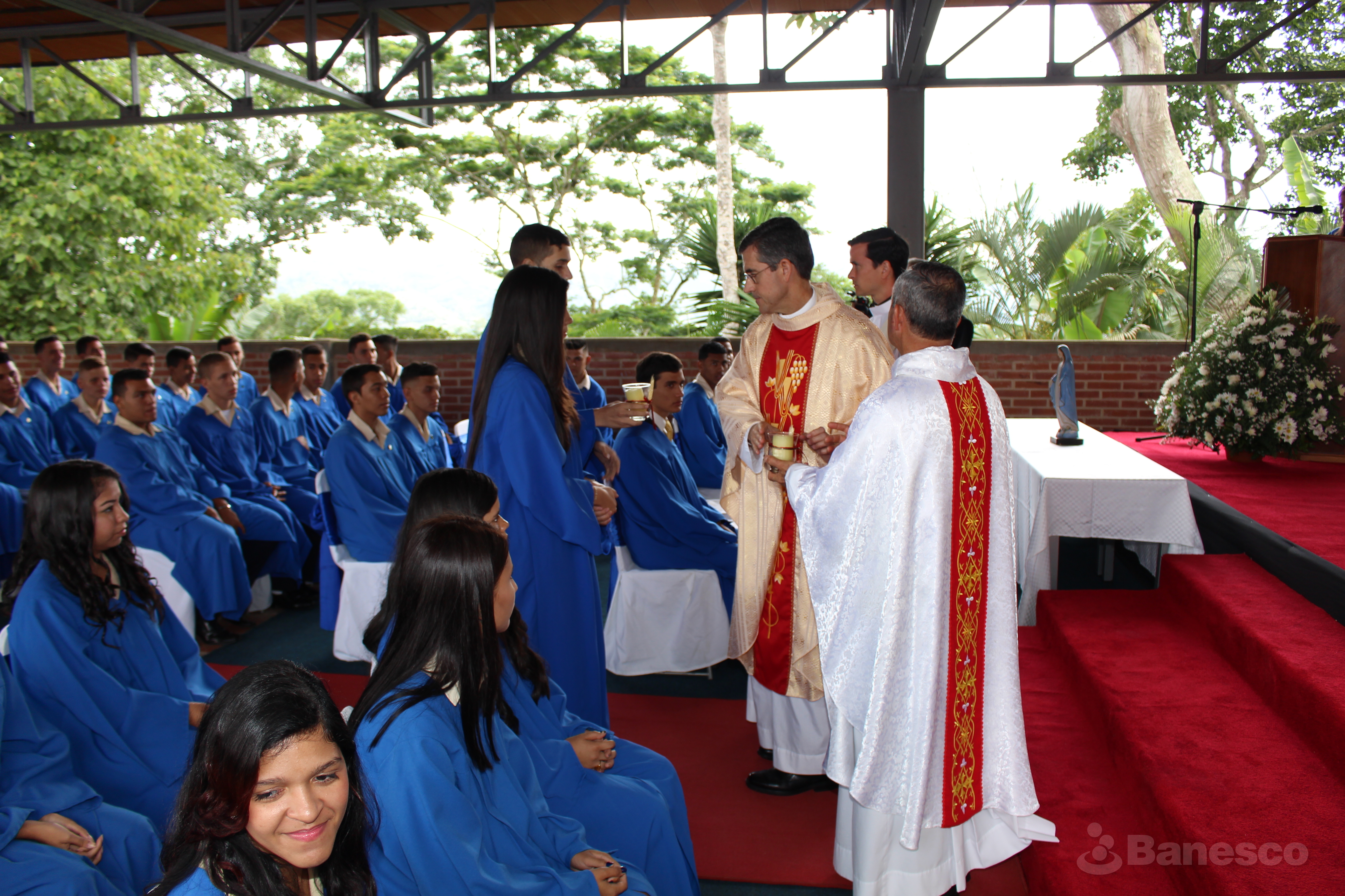 Estudiantes haciendo entrega de las velas a los sacerdotes para iniciar la misa.