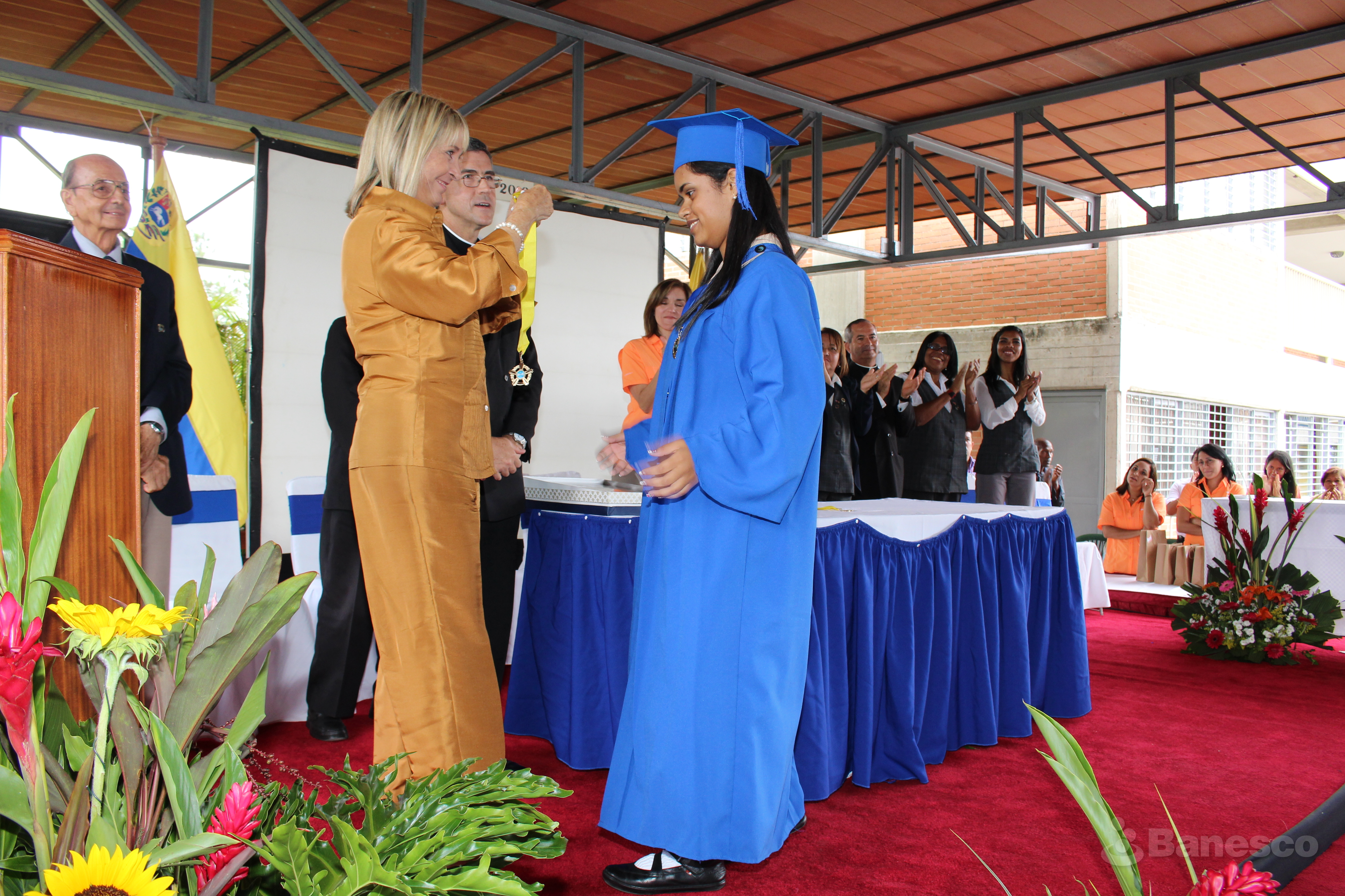 Entrega de medalla a alumna durante el acto de graduación de la XIII promoción del Colegio Mano Amiga.