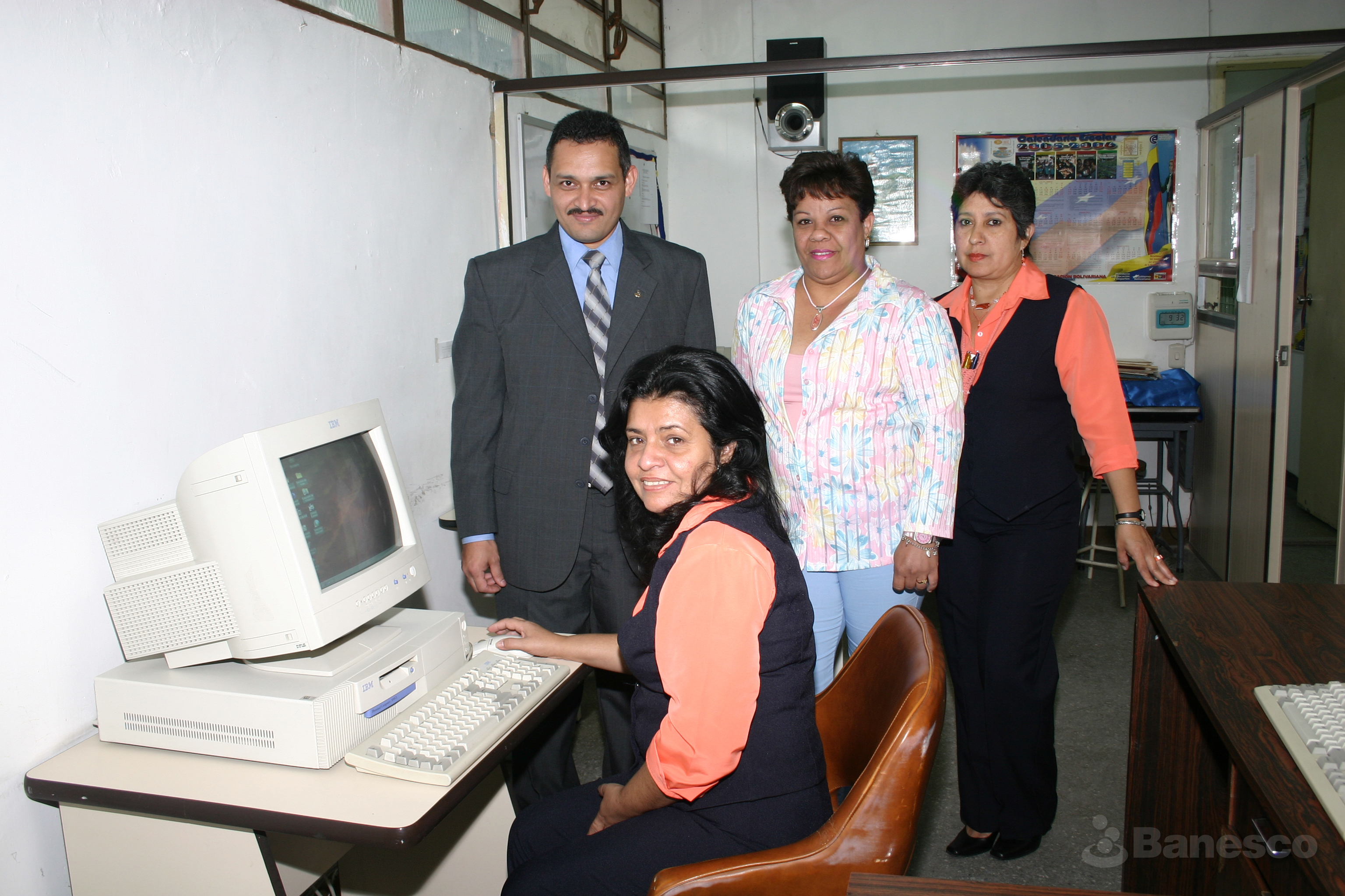 Representante de Banesco junto a docentes durante la entrega de computadoras a la Escuela Mireya Venegas, como parte del programa de Responsabilidad Social Empresarial de la institución financiera.