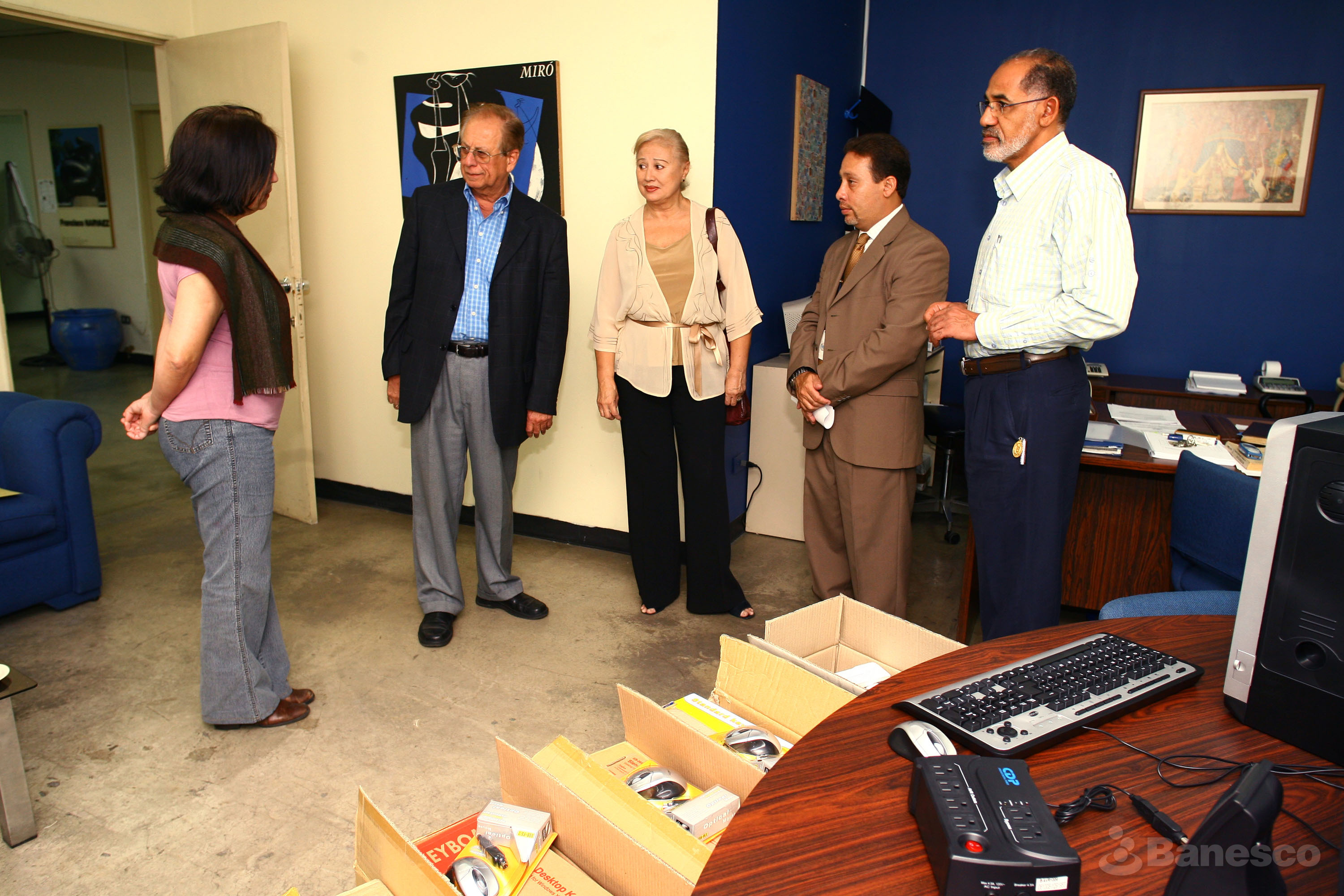 Representante de Banesco junto a personal de la Universidad Central de Venezuela durante la entrega de cinco (5) computadoras nuevas para la Escuela de Administración y Contaduría como parte del programa de Responsabilidad Social Empresarial de la institución financiera.