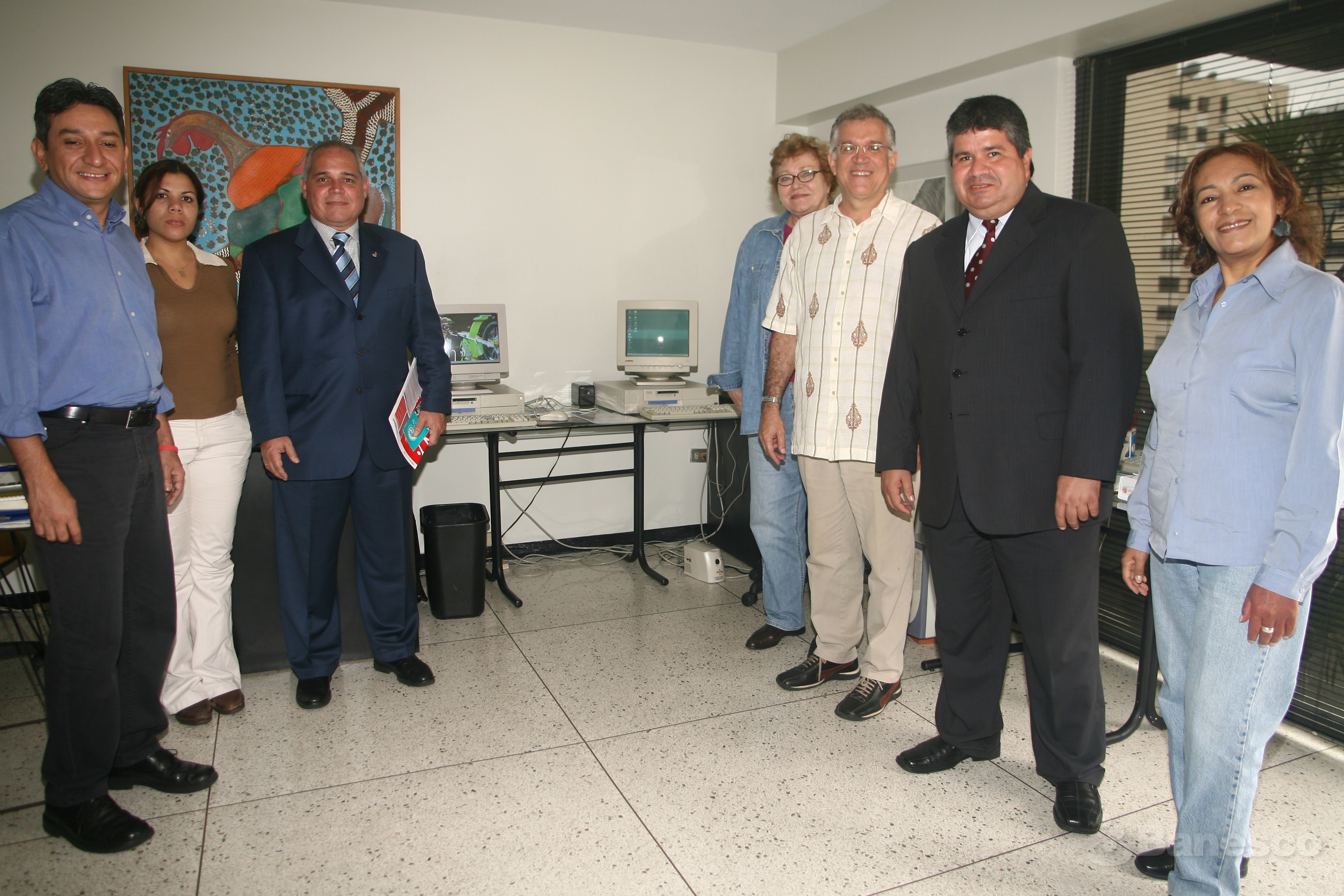 Representantes de la Asociación Civil Acción Ciudadana contra el Sida (ACCSI) junto a personal de Banesco, durante la entrega del donativo de cuatro (4) computadoras realizado para el equipamiento de la institución.