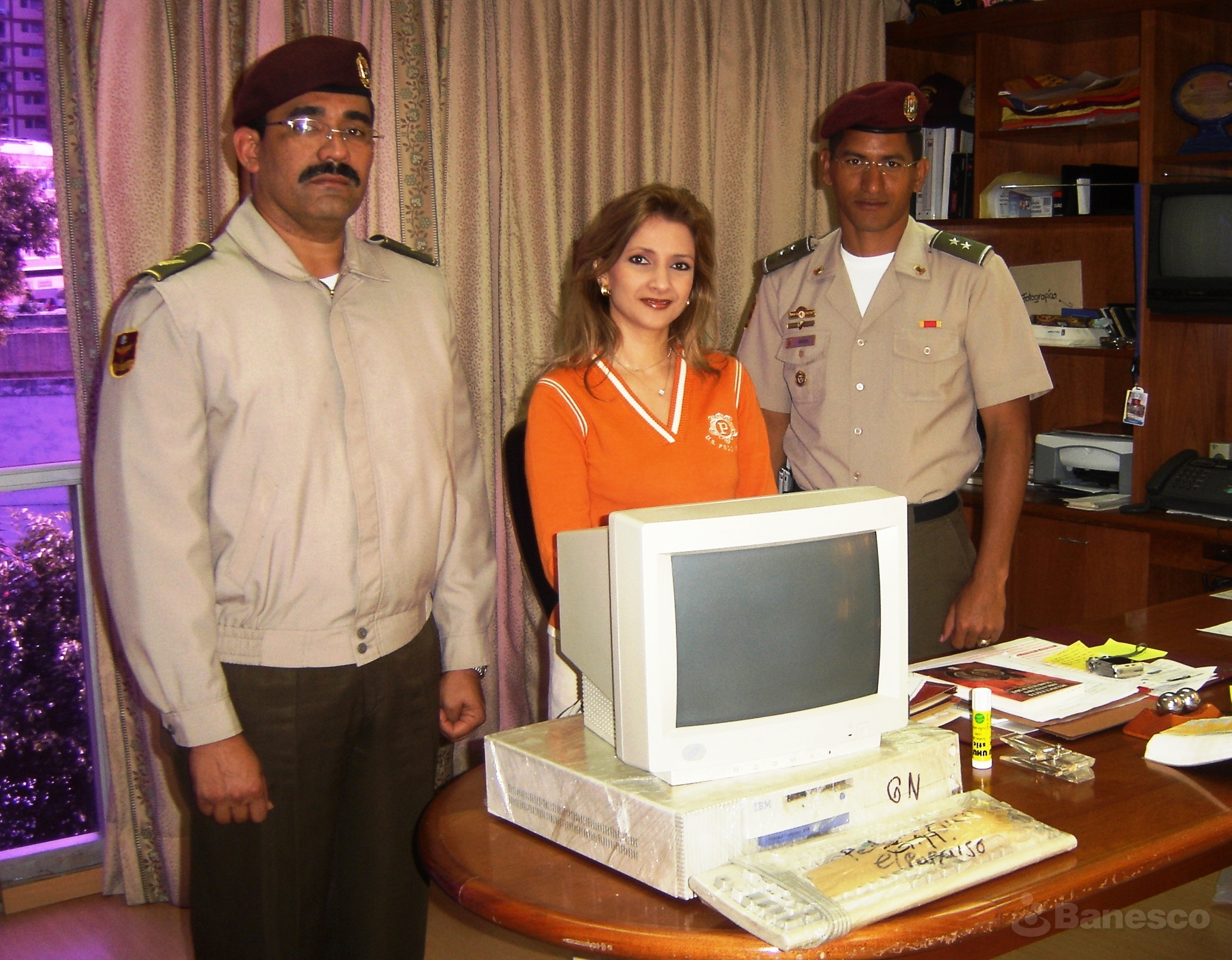 Representantes de la Guardia Nacional, durante la entrega del donativo de computadoras realizado para el equipamiento de la institución, en el marco del programa de Responsabilidad Social Empresarial de la entidad financiera.