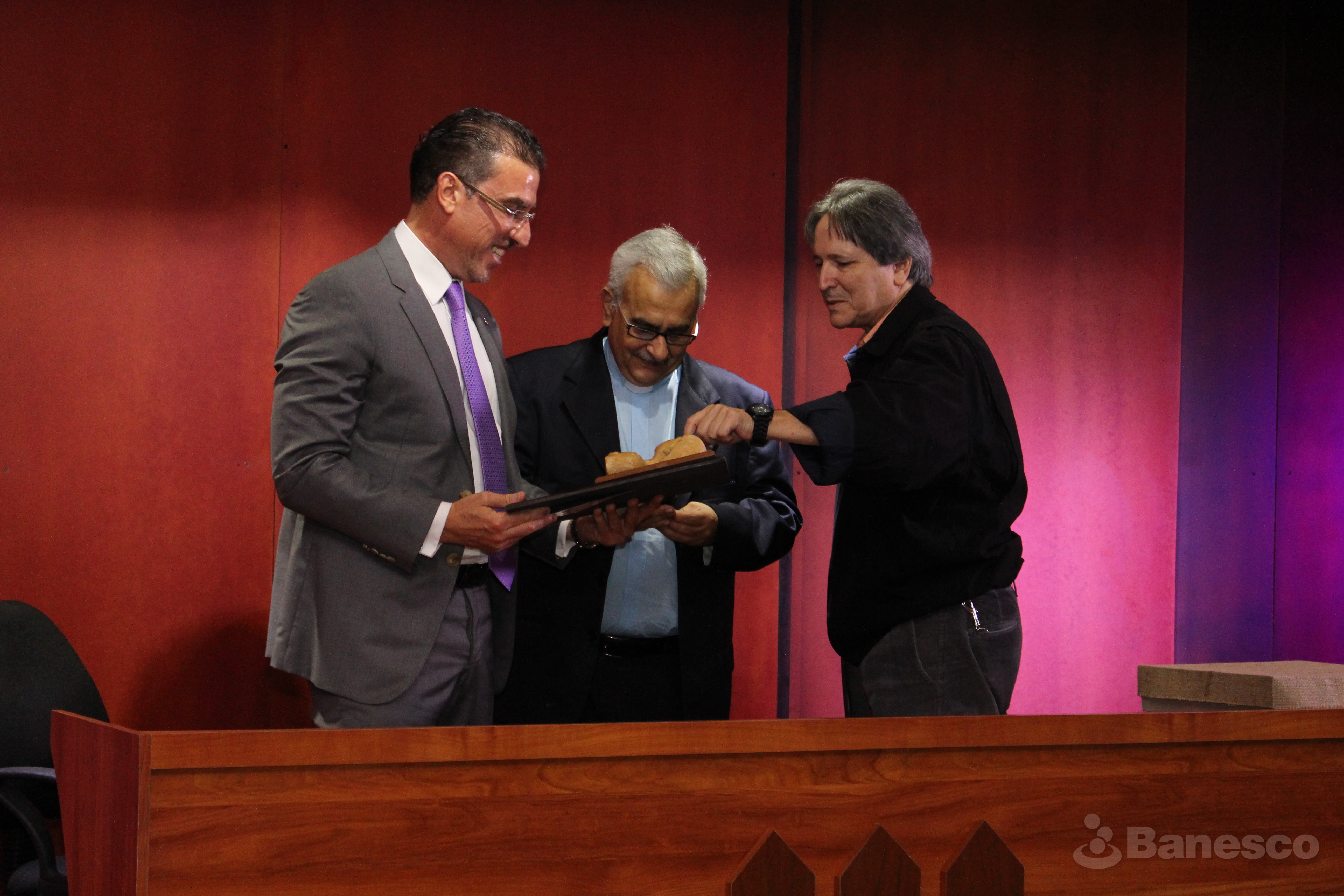 Francisco José Virtuoso s.j., rector de la UCAB y Rafael Estrada, vicerrector académico de la UCAB hacen entrega de reconocimiento a Miguel Ángel Marcano, presidente ejecutivo de Banesco, durante el acto de entrega de “Becas Universitarias Banesco” para estudiantes del núcleo UCAB - Ciudad Guayana.