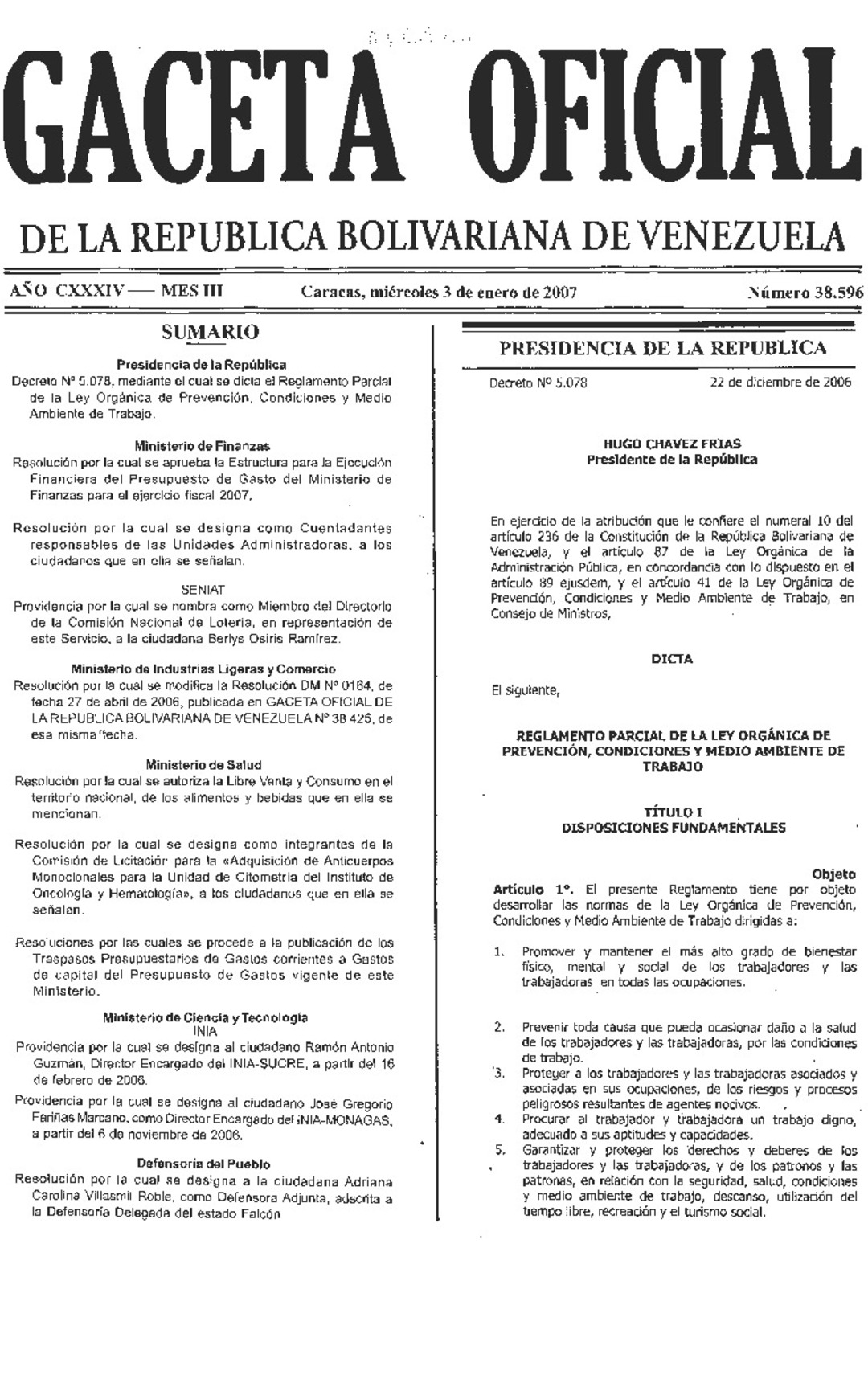 Ley Orgánica de Prevención, Condiciones y Medio Ambiente de Trabajo (GO N° 38.596, 03 de enero de 2007)