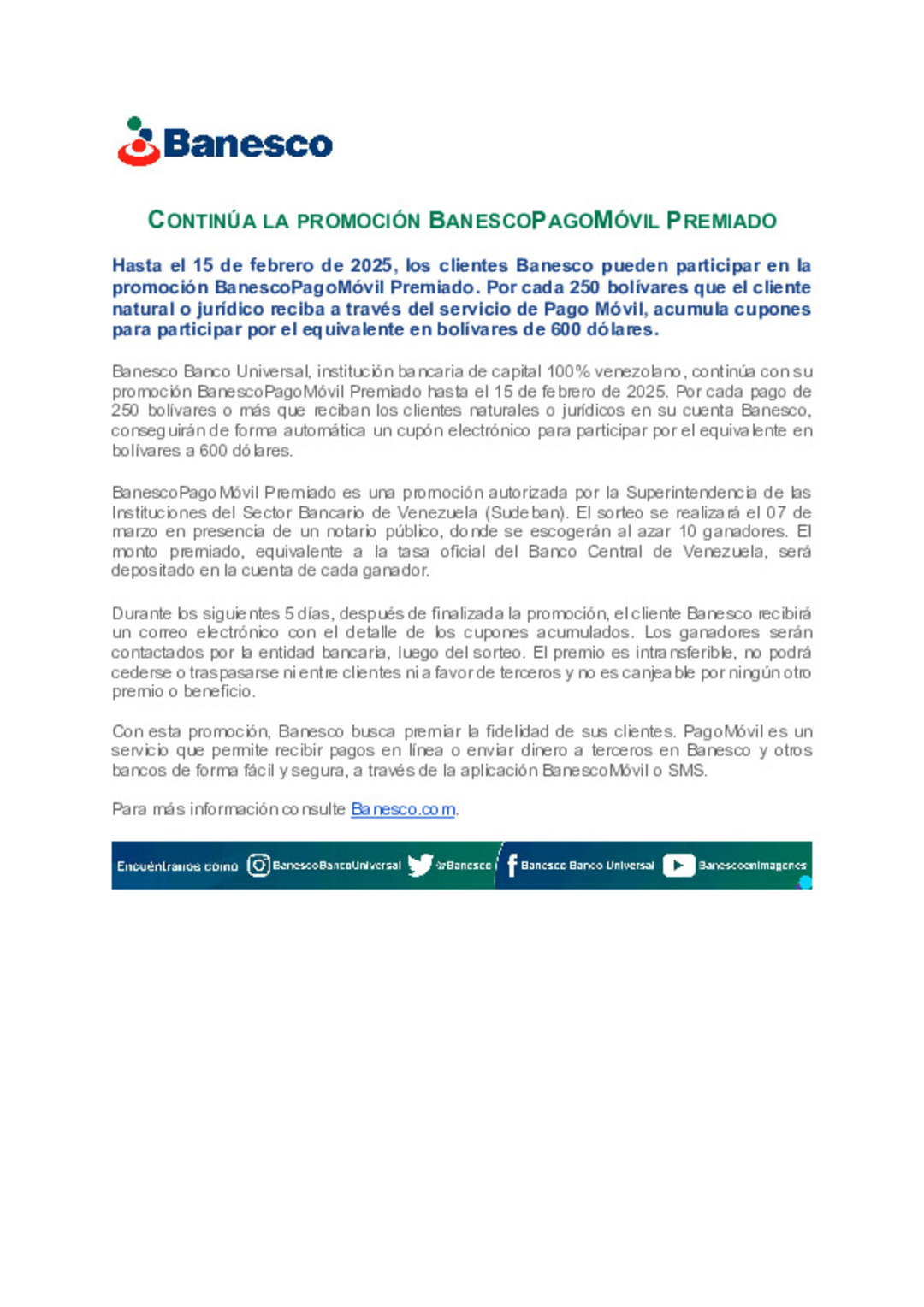 Hasta el 15 de febrero de 2025, los clientes Banesco pueden participar en la promoción BanescoPagoMóvil Premiado. Por cada 250 bolívares que el cliente natural o jurídico reciba a través del servicio de Pago Móvil, acumula cupones para participar por el equivalente en bolívares de 600 dólares.