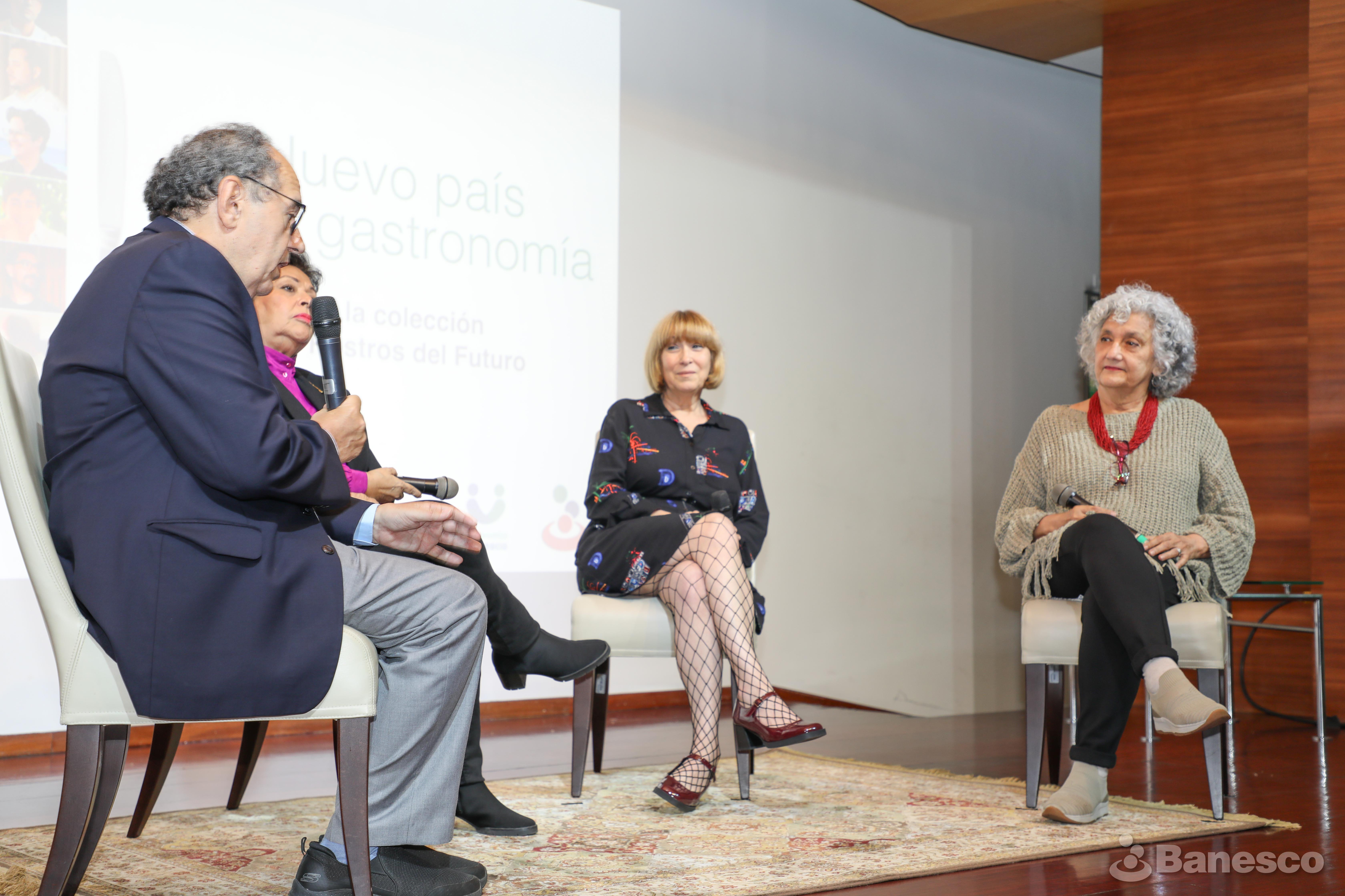 Antonio López Ortega compilador y coordinador editorial del libro "Nuevo país de la gastronomía", conversando con Ivanova Decán, Maruja Dagnino y Ocarina Castillo, durante el bautizo realizado en el auditorio Fernando Crespo Suñer de Ciudad Banesco.
