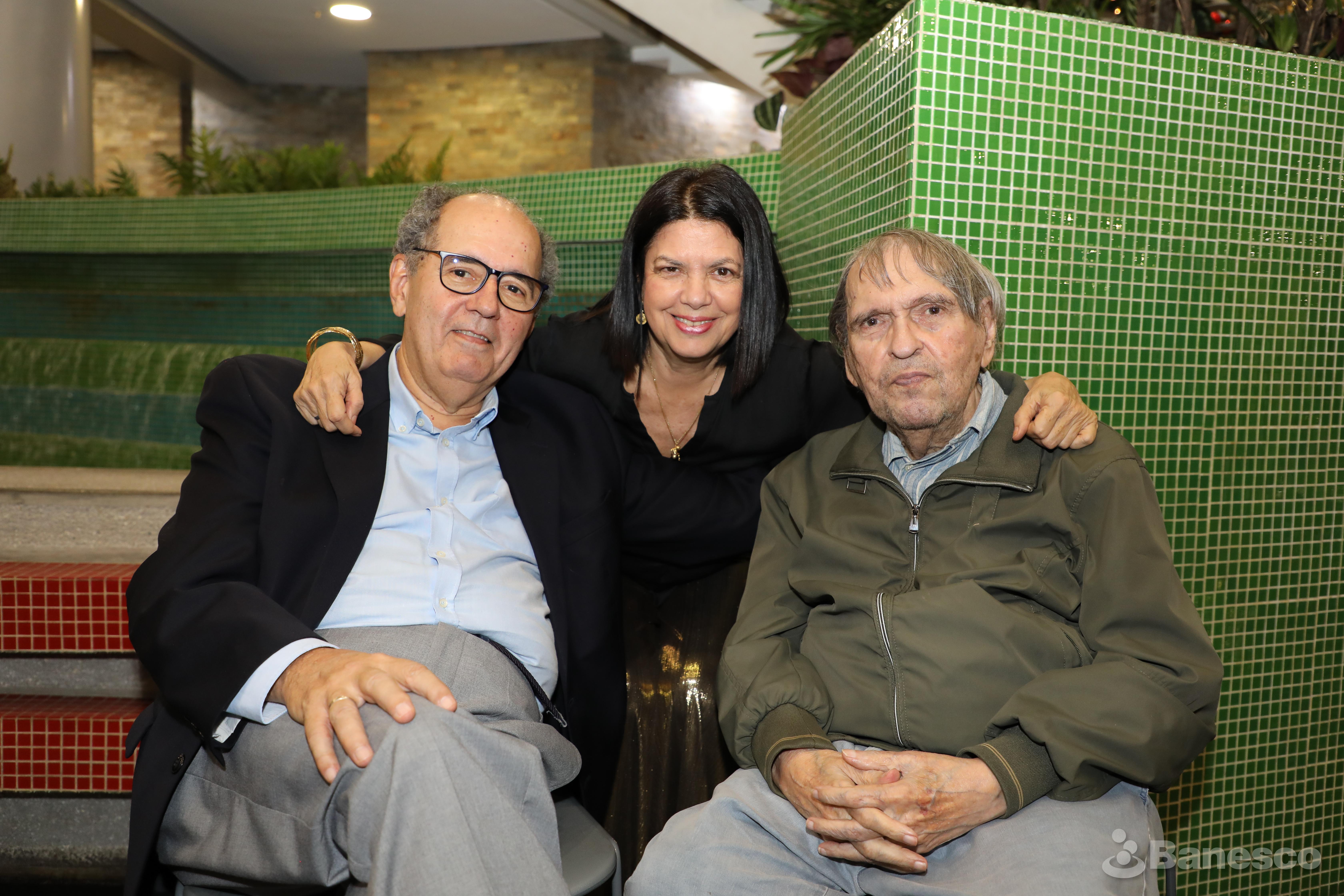 El escritor Antonio López Ortega, la historiadora Inés Quintero junto al poeta Rafael Cadenas, durante la celebración del bautizo del libro "Nuevo país de la gastronomía", evento organizado por la Vp. de Comunicaciones y RSE de Banesco.