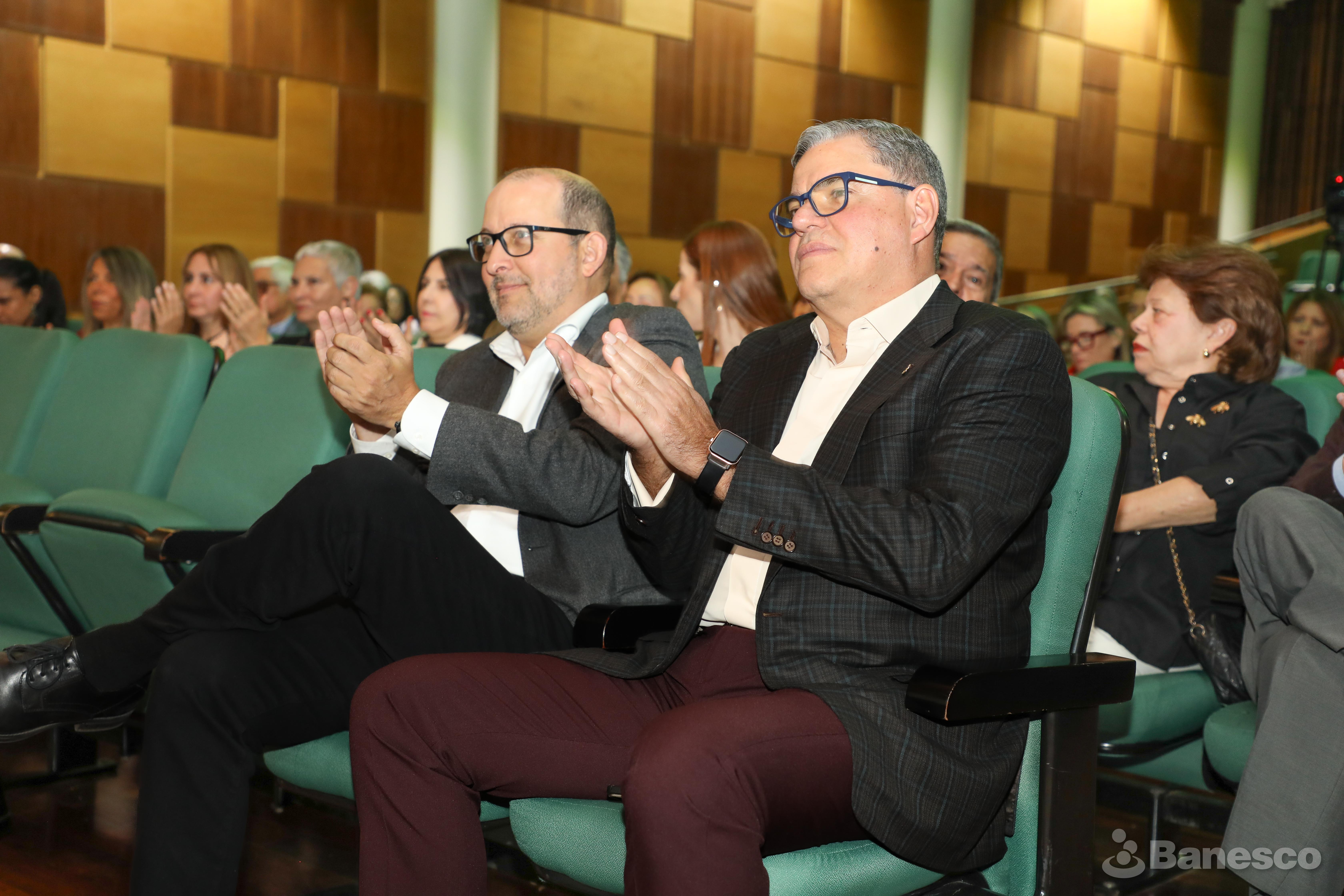 Carlos Eduardo Millán, presidente ejecutivo de Banesco junto a Marco Ortega Vargas, presidente de la Junta Directiva, durante el bautizo del libro "Nuevo país de la gastronomía" evento realizado en el auditorio Fernando Crespo Suñer.
