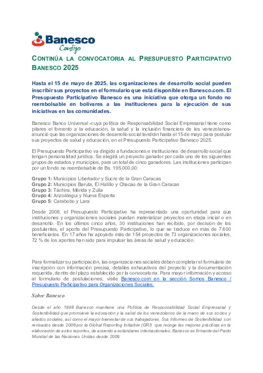 Hasta el 15 de mayo de 2025, las organizaciones de desarrollo social pueden inscribir sus proyectos en el formulario que está disponible en Banesco.com. El Presupuesto Participativo Banesco es una iniciativa que otorga un fondo no reembolsable en bolívares a las instituciones para la ejecución de sus iniciativas en las comunidades.
