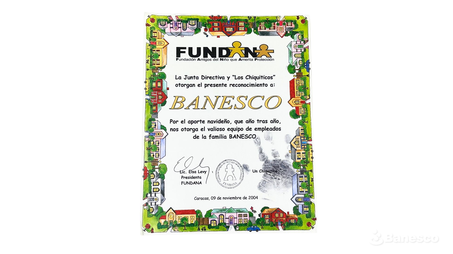 La Junta Direciva de Fundana y la Villa de los Chiquiticos le otorga a Banesco Banco Universal el reconocimiento por el aporte navideño que año tras año les otorga el equipo de empleados de la familia Banesco a la institución.