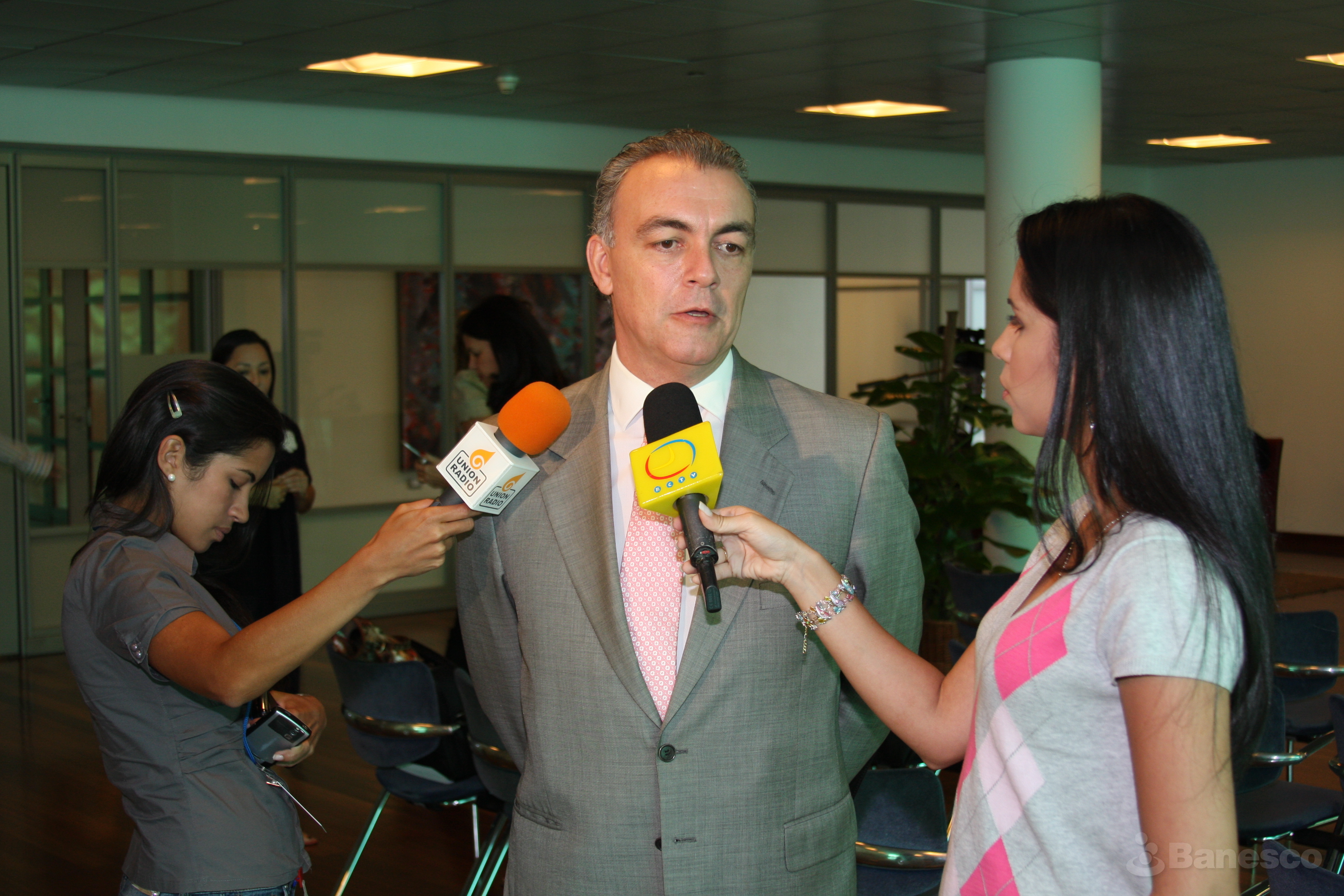 Luis Xavier Luján, vicepresidente ejecutivo de la Junta Directiva de Banesco, es entrevistado por medios de comunicación durante la rueda de prensa para promocionar el concurso de ensayos organizado por la institución bancaria titulado “La Independencia de Venezuela, 200 años después”.