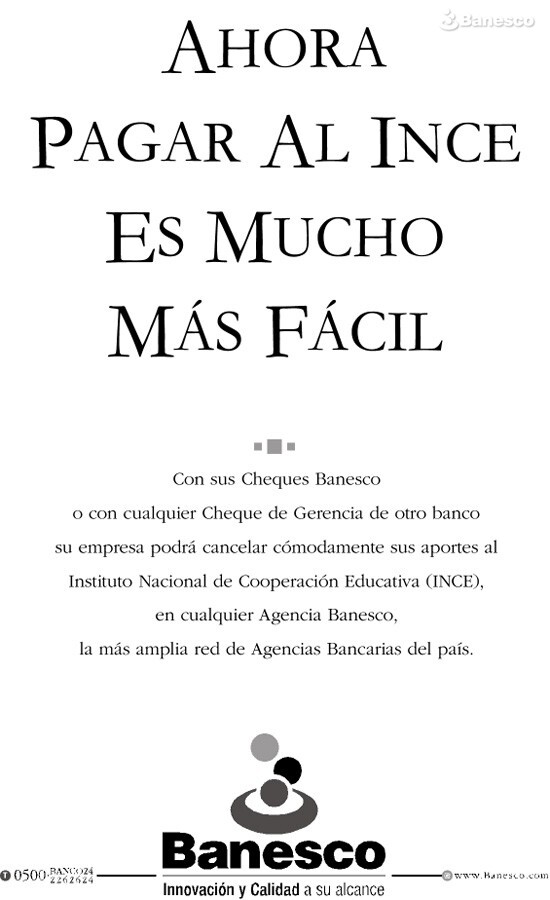 Con sus cheques Banesco o con cualquier cheque de gerencia de otro banco su empresa podrá cancelar cómodamente sus aportes al Instituto Nacional de Cooperación Educativa (INCE).
