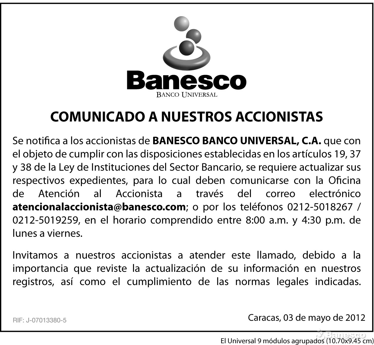 Comunicado para los accionistas de Banesco, para notificar el inicio de la actualización de expedientes.