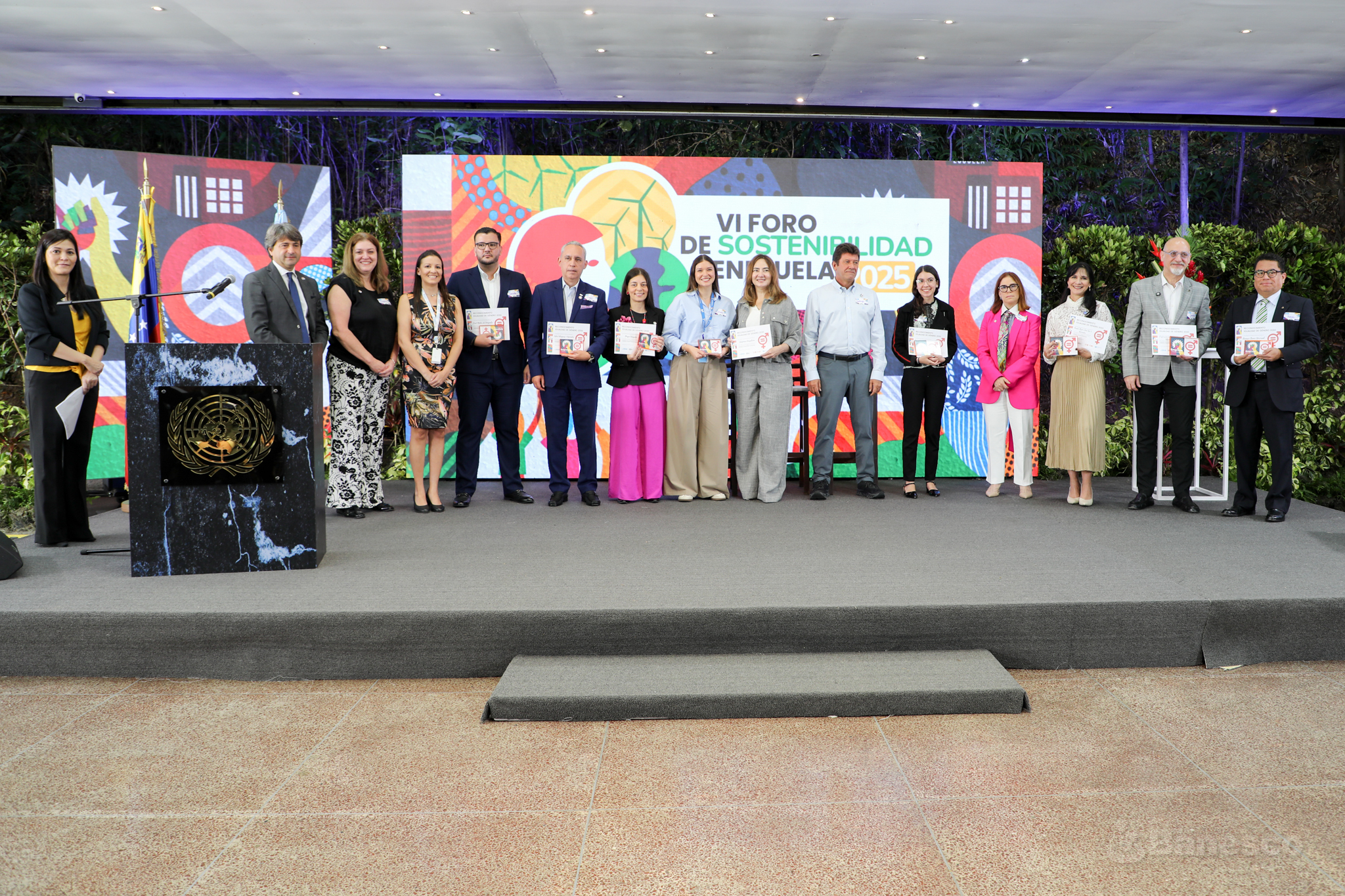 Representantes de diversas organizaciones, entre ellos Rubén Ángel, Vp. de Capital Humano de Banesco, sostienen los reconocimientos otorgados durante el "VI Foro de Sostenibilidad Venezuela 2025".