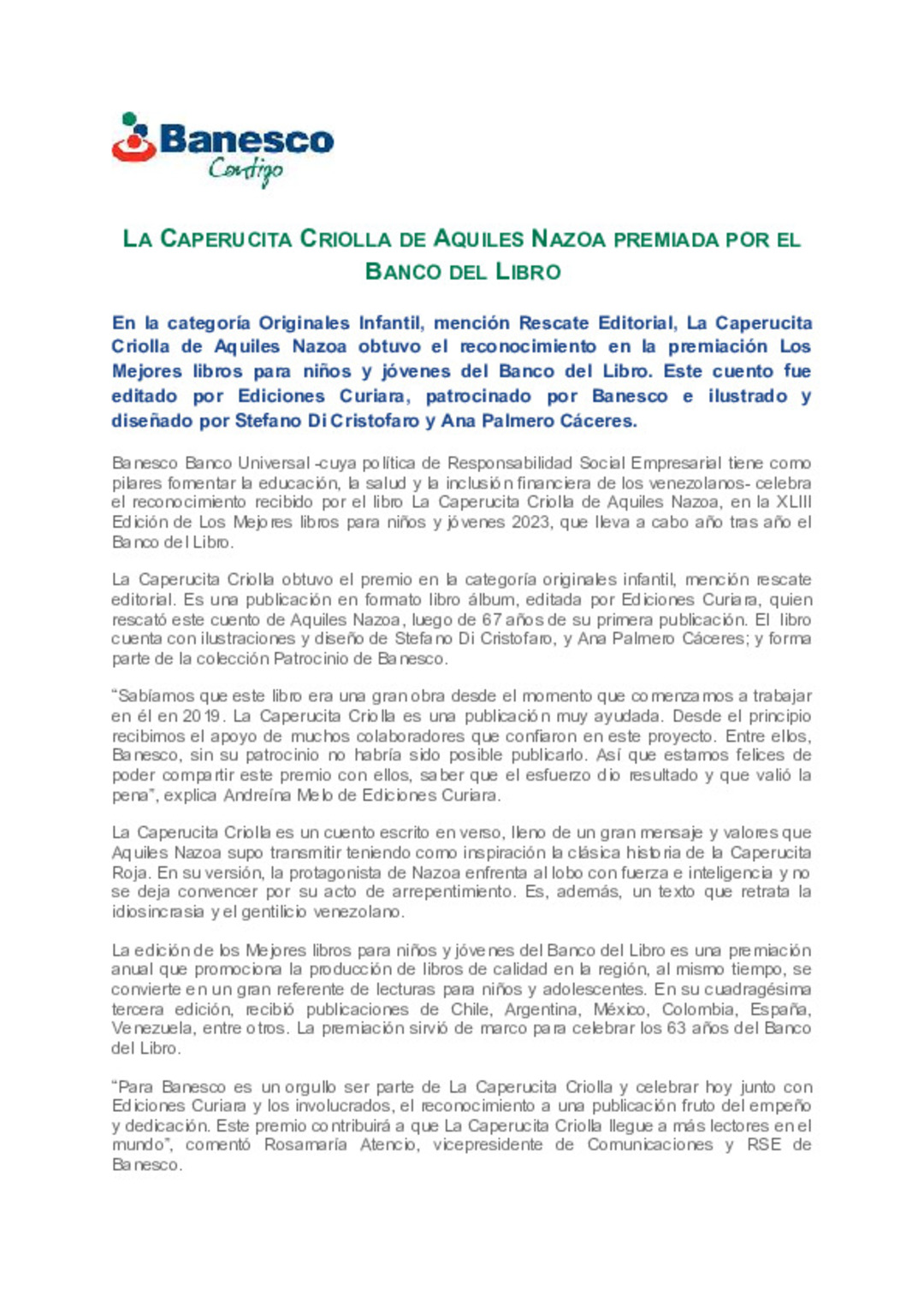 La Caperucita Criolla de Aquiles Nazoa premiada por el Banco del Libro