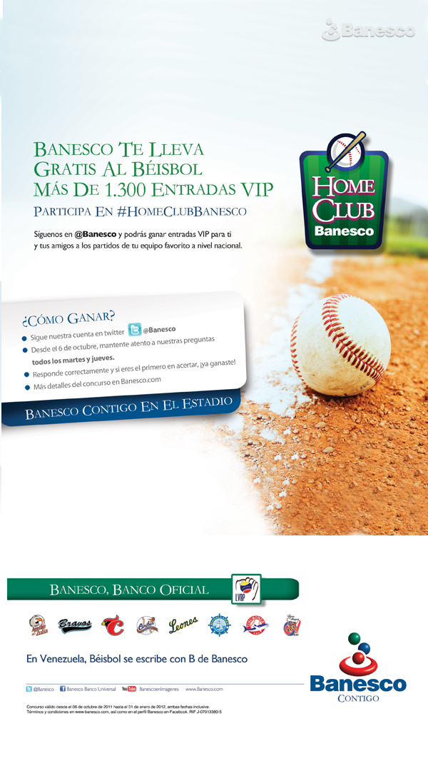 Promoción del Home Club Banesco, mediante el cual a través de la cuenta de Twitter @Banesco, podrás ganar entradas VIP para asistir a los partidos de tu equipo de beisbol favorito a nivel nacional.