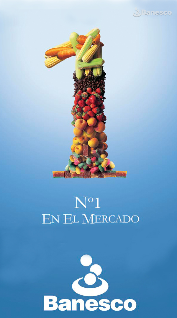 Campaña de Banesco N° 1 en el mercado, con una imagen animada de el numero 1 hecho de frutas y hortalizas.