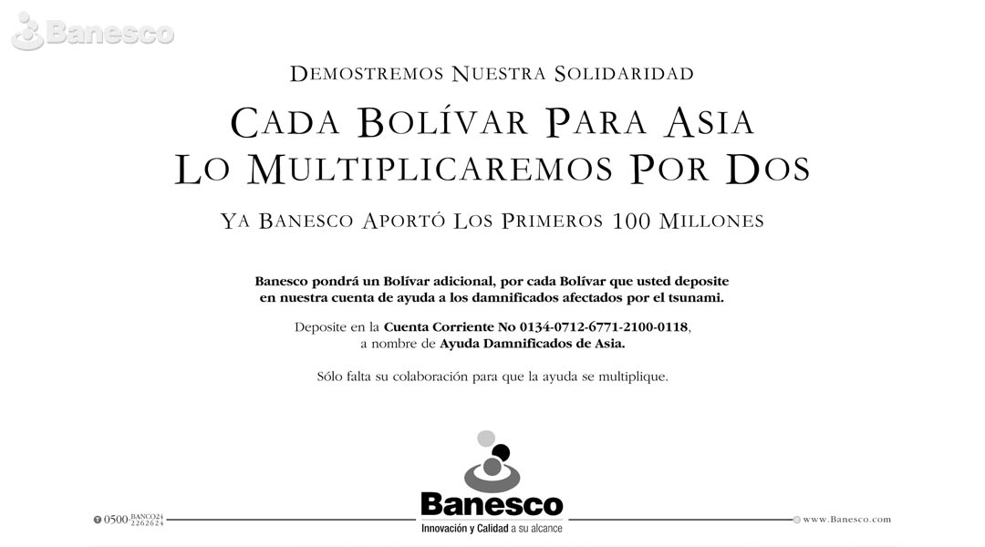 Campaña de Banesco Banco Universal de solidaridad por el tsunami ocurrido en Asia, donde difunden una cuenta bancaria para prestar ayuda a los damnificados afectados. La idea de la campaña es que por cada bolívar que las personas depositen para la ayuda, Banesco pondrá un bolívar más. El eslogan de la campaña fue: ''cada bolívar para Asia lo multiplicaremos por dos''.