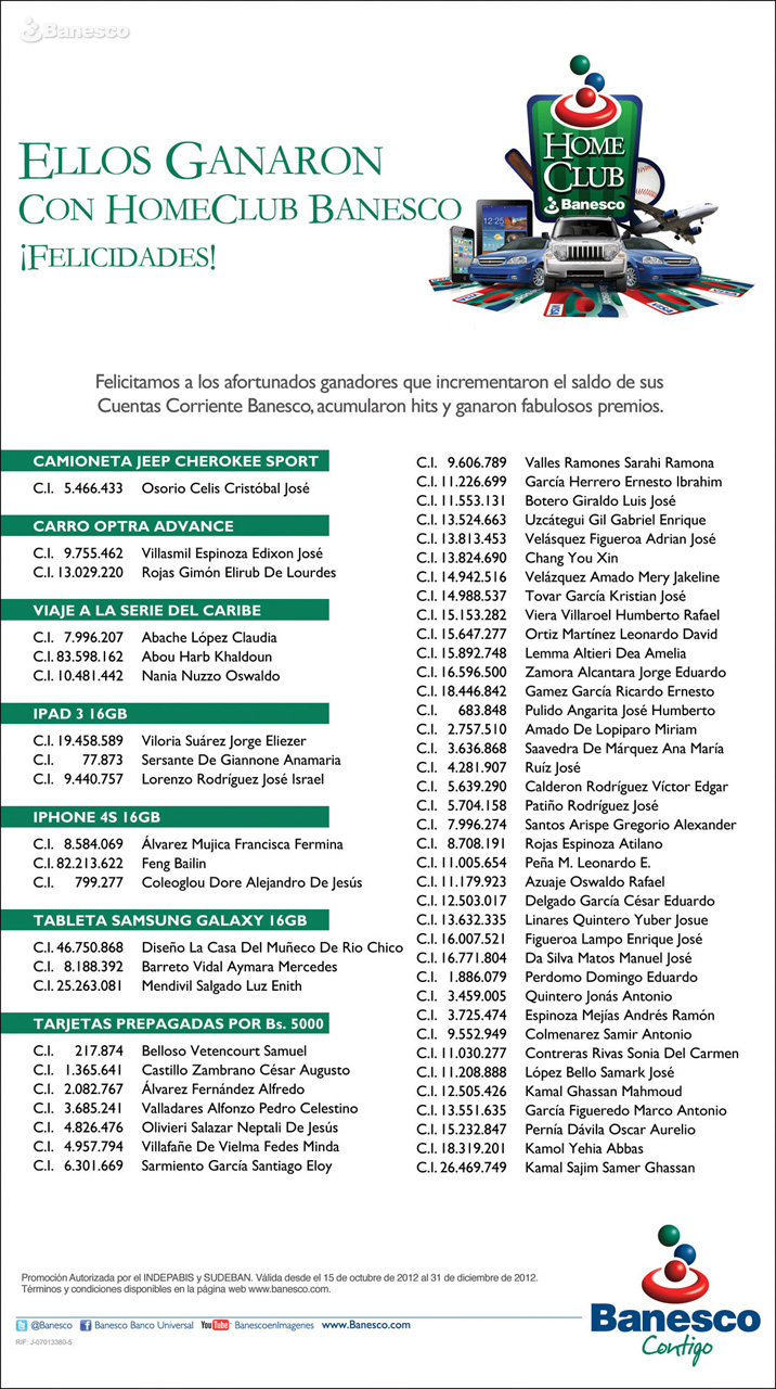 Banesco publica la lista de los ganadores que incrementaron su saldo e sus cuentas corrientes Banesco, en la que tenían que acumular hits para poder ganar muchos premios.