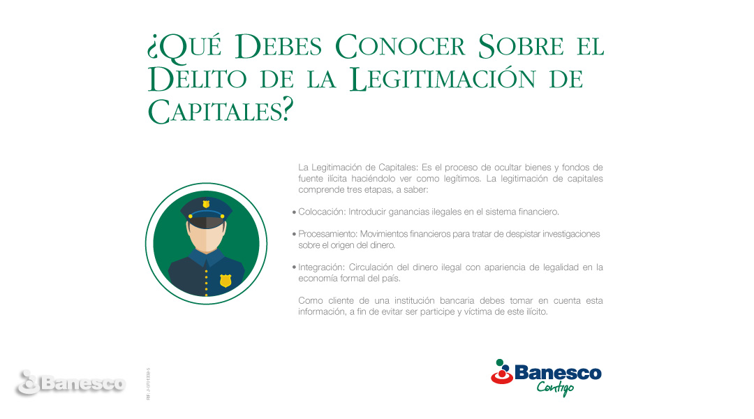 Dar a conocer el proceso de ocultar bienes y fondos de fuente ilícita haciéndolo ver como legítimos. Si es cliente de una institución bancaria debe tomar en cuenta esta información, a fin de evitar ser participe y víctima de este ilícito.