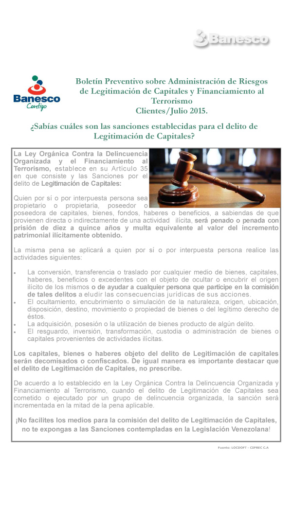 Dar a conocer a los clientes la Ley Orgánica contra la Delincuencia Organizada y el Financiamiento al Terrorismo, y lo que establece en el Artículo 35 más las sanciones por el delito de Legitimación de Capitales.