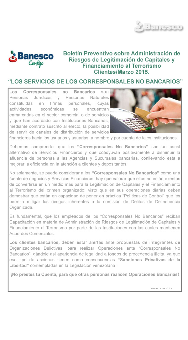 Dar a entender a los clientes bancarios, que deben estar alertas ante propuestas de integrantes de Organizaciones Delictivas, que quieren realizar Operaciones “Corresponsales No Bancarios”, dándole apariencia de legalidad pero son de procedencia ilícita.
