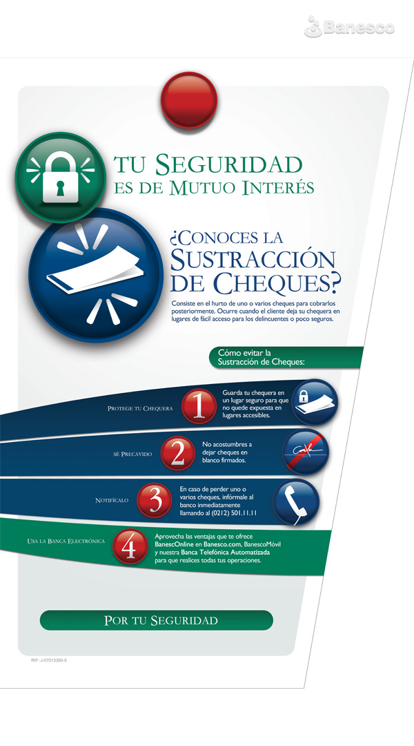 Campaña para concientizar acerca de la sustracción de cheques, que consiste en el hurto de uno o varios cheques para ser cobrados posteriormente, y ocurre cuando el cliente deja sus chequeras en lugares de fácil acceso.