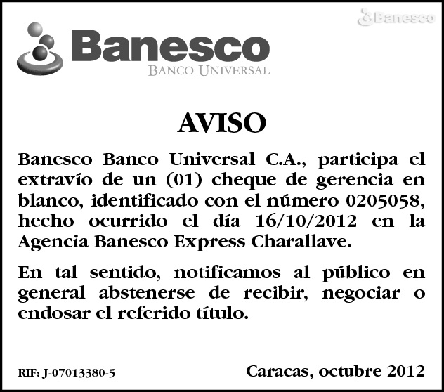 Aviso de Banesco Banco Universal, en el que menciona el extravío de uno de sus cheques de gerencia, en la Agencia Banesco Express Charallave. Exhorta al público de no negociar, recibir o endosar dicho cheque.