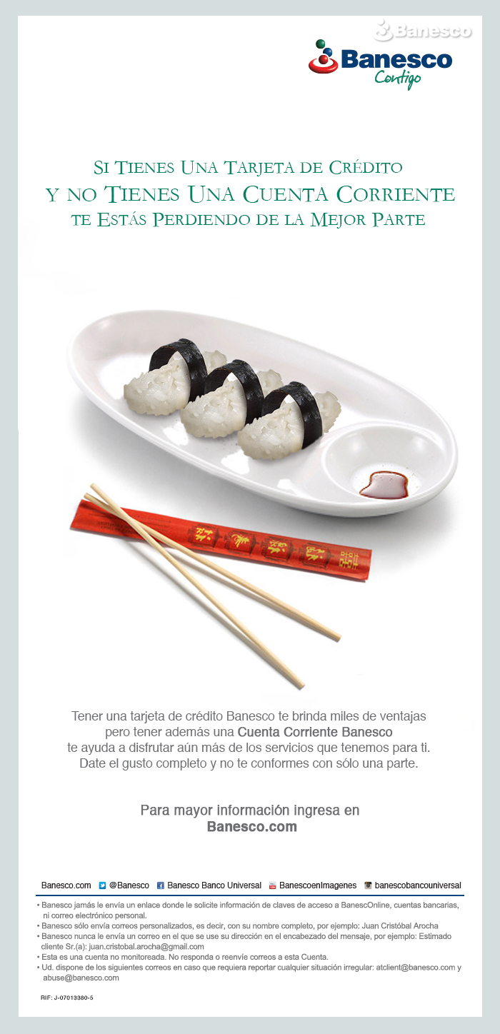 Promoción de la cuenta corriente Banesco: ''Si tienes una tarjeta de crédito y no tienes una cuenta corriente, te estás perdiendo de la mejor parte''. Incentivo a tener una cuenta corriente Banesco para disfrutar más aún de los beneficios que traemos para ti.