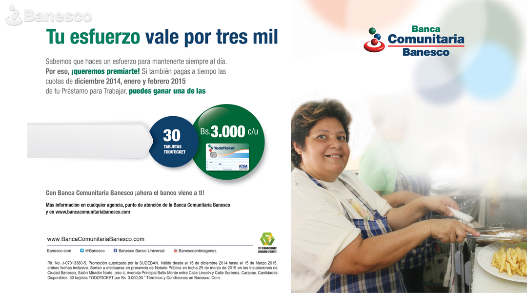 Promoción de la Banca Comunitaria Banesco: ''tu esfuerzo vale por tres mil'', en la que promociona 30 tarjetas todoticket con 3.000 bolívares, si se paga a tiempo las cuotas de diciembre 2014 y enero 2015 del Préstamo para Trabajar.