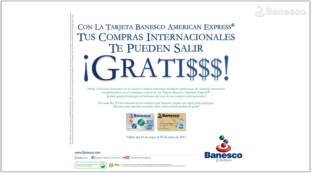 Promoción de la tarjeta de crédito American Express de Banesco Banco Universal, que consiste en que por cada consumo de 215 bolívares, desde el 16 de mayo al 30 de junio de 2011, participas por el reintegro en bolívares del total de tus compras.