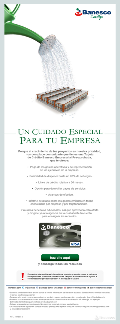 Aviso para email: Comunicado de tarjeta de crédito Banesco Empresarial pre-aprobada. La cual ofrece: pago de los gastos operativo, 20% de sobre giro, línea de crédito a 36 meses, opción de domicilio de pago, avance de efectivo y informe detallado sobre gastos emitidos.